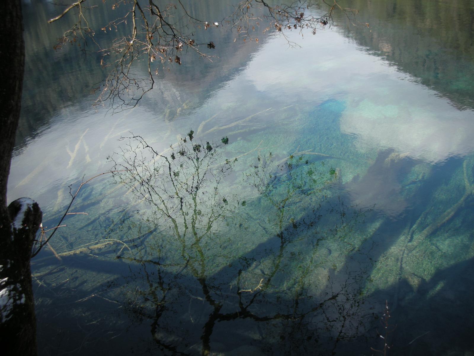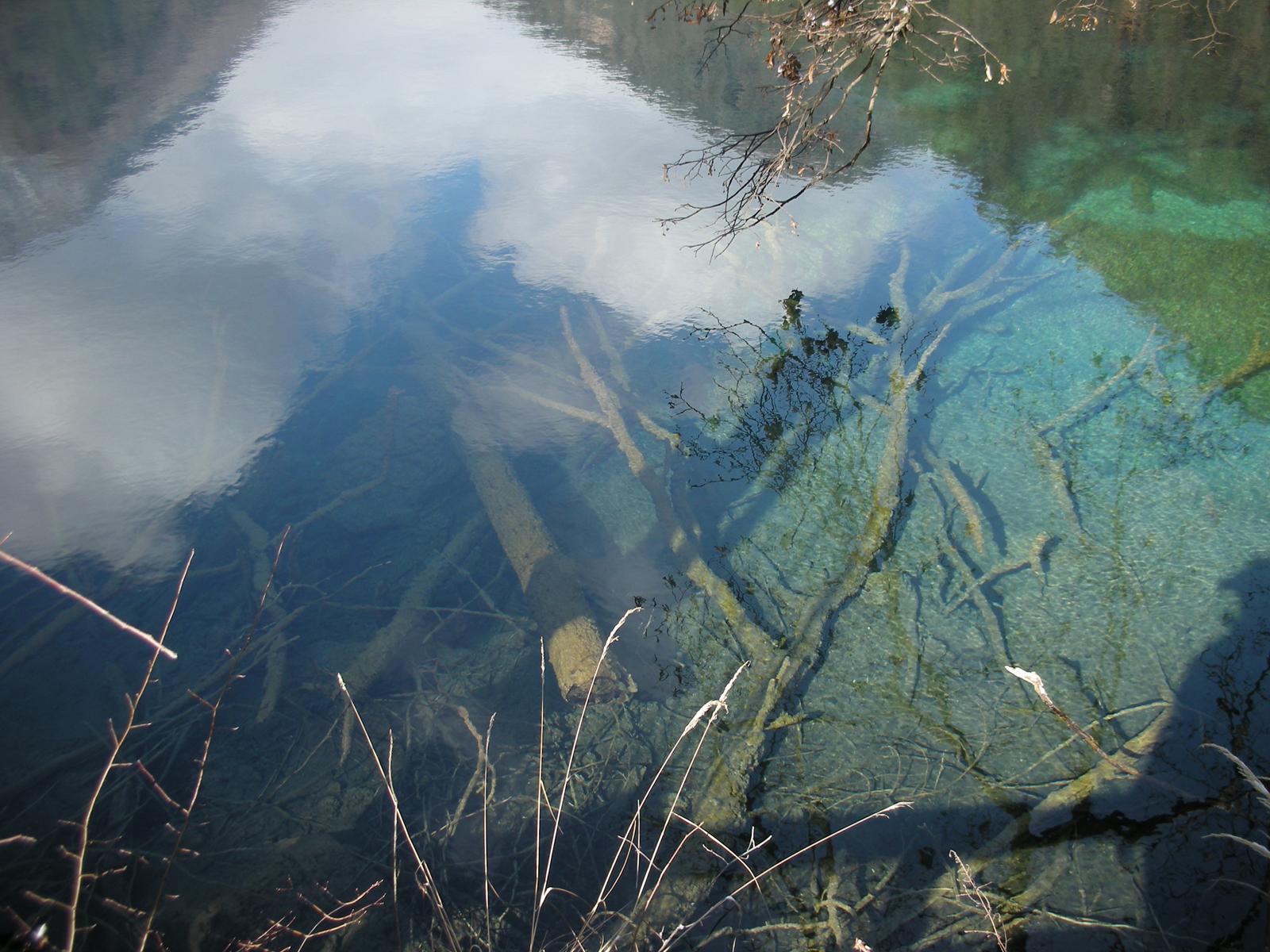 (水に含まれる石灰に浄化作用があるため、湖底に沈んだ大木もくっきり見えます。)