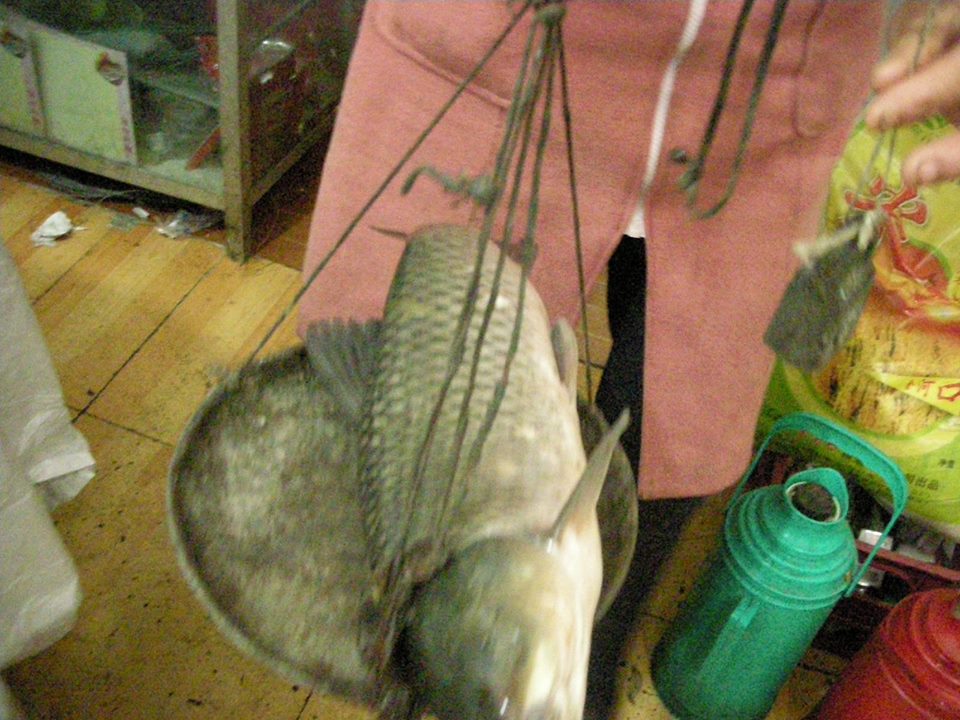 (漢民族が作った地元料理店。大きなコイを量ってます。チベット族は葬式によって魚に遺体を食べてもらう水葬があるため食べません。)
