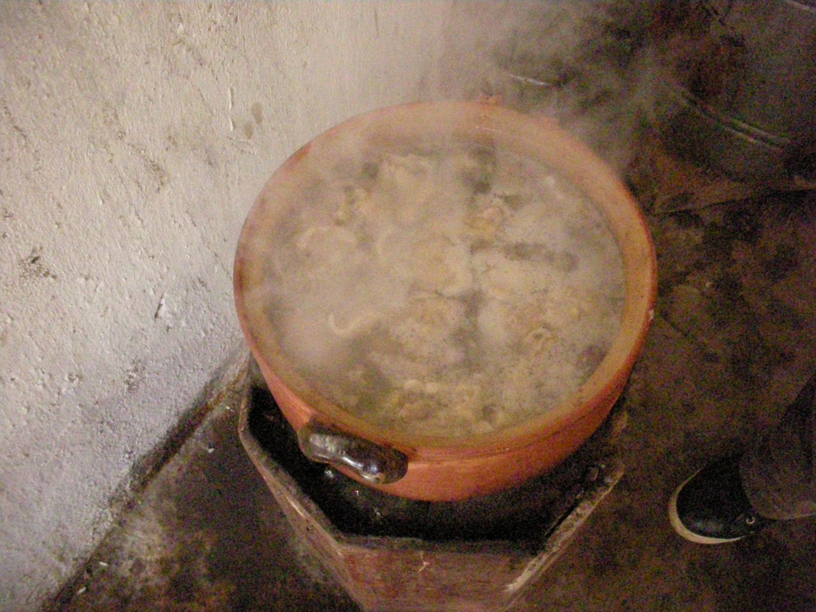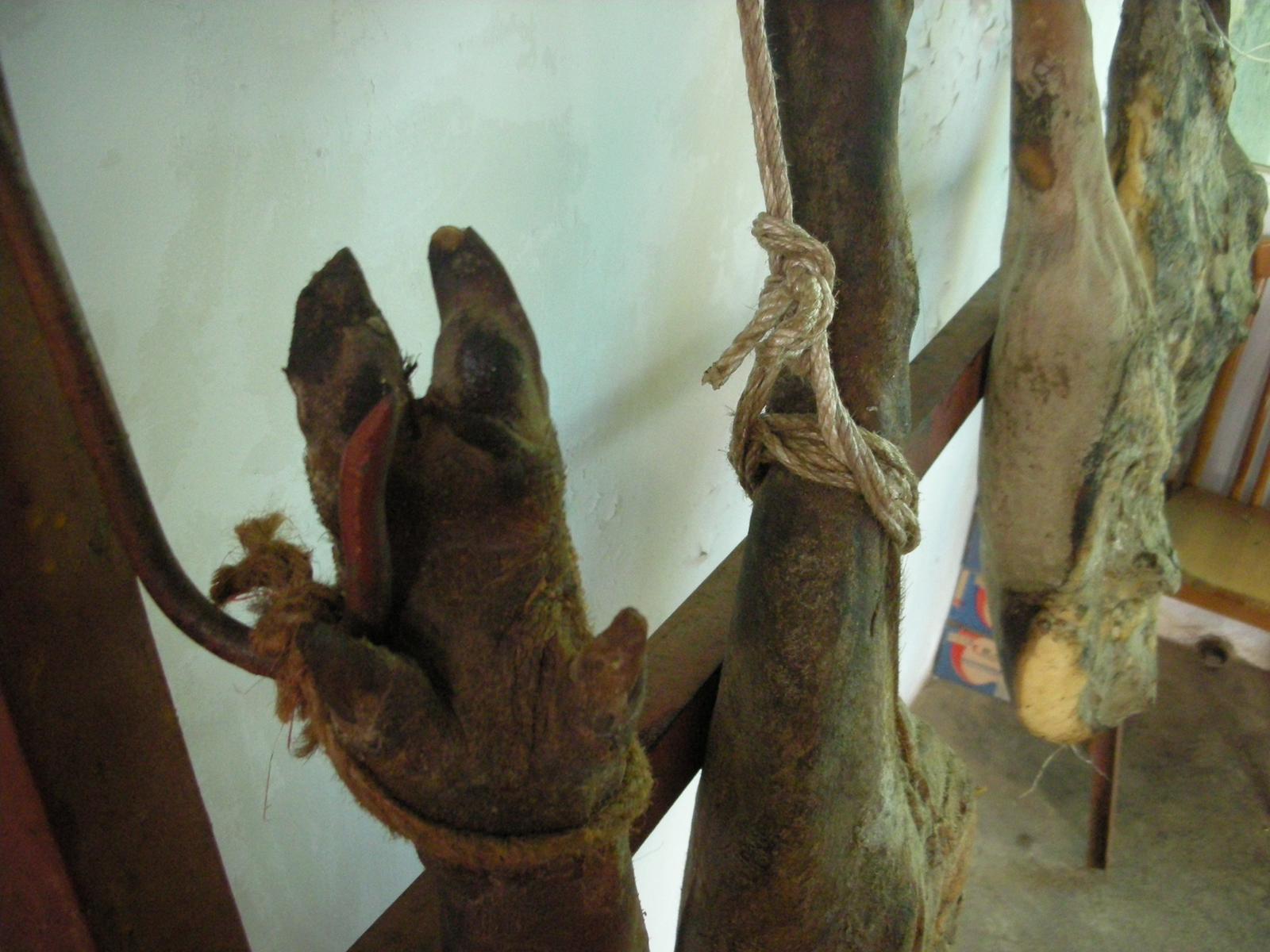(豚の後脚に塩を塗りつけて、自家製の生ハム作りしていました。)