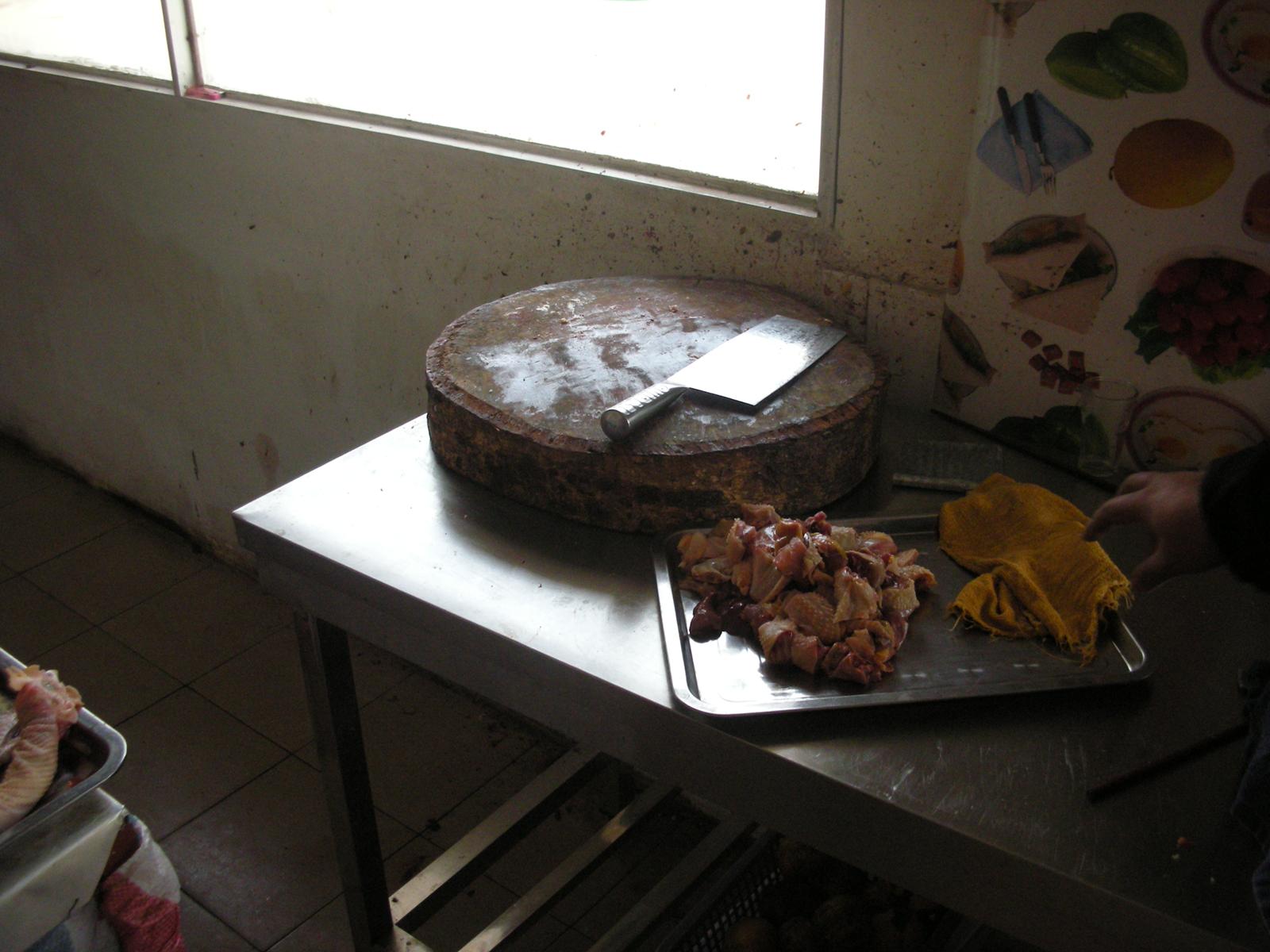 (ごつい中華包丁で鶏の肉をぶつ切りにします。まな板が厚くて丸いですね!)