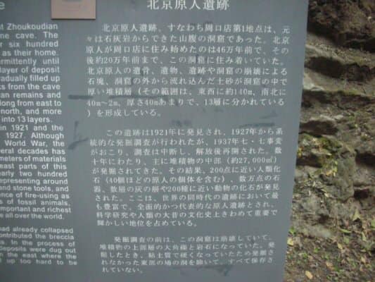 北京の南西方向に約50kmにある龍骨山という石灰岩から成るなだらかな丘陵の一部が陥没して巨大な穴状になっており、その側面から多数の動物化石に混じって人骨と石器が発見されました。最初に見つかったのは一個の歯だけでしたが、その後発掘が進み、頭蓋骨も発見され、洞窟からは火が使用された跡も見つかりました。さらに第二次世界大戦後には山頂の洞窟からも人骨が発見され、こちらは新人に該当する周口店上洞人と名付けられています。