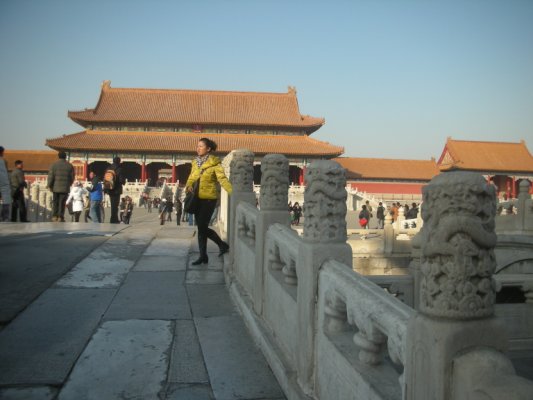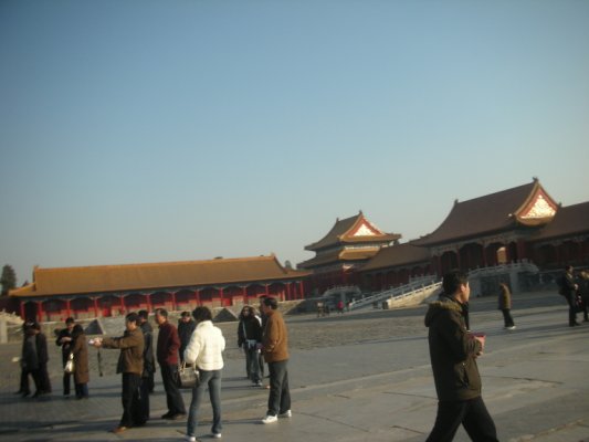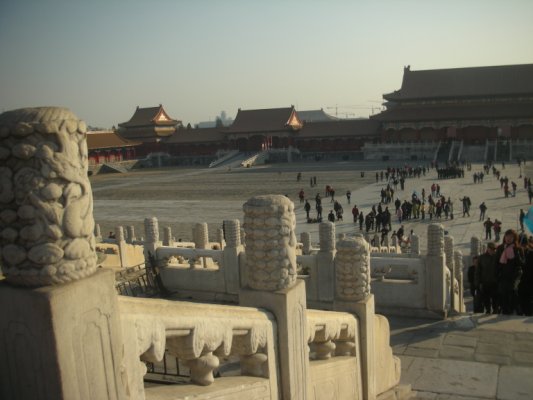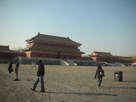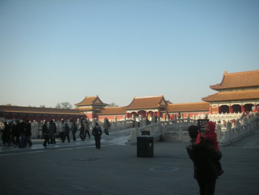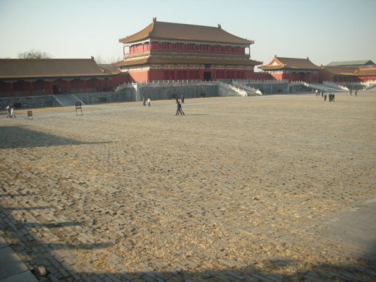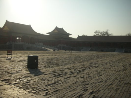 (延々と広がる石畳。この広場は、3歳にも満たない幼い溥儀が、皇帝に即位をしたシーンが撮影された場所ですね。他にも、少年の溥儀が、城から追い出される乳母のお輿を追いかけたシーンもここだと思います。)