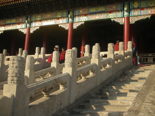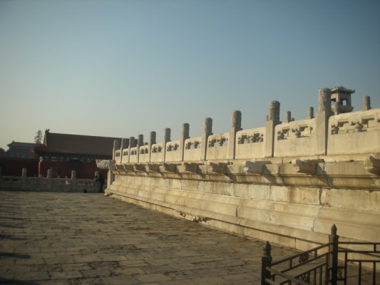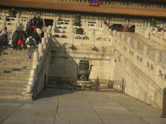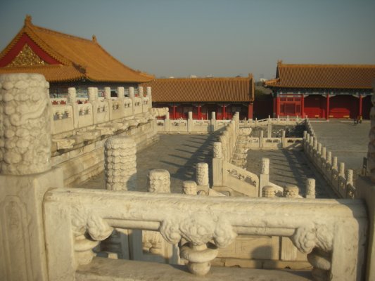 (太和殿、中和殿、保和殿は、白大理石の三重の基台の上に建てられていますが、中和殿の両サイド(西側と東側)には、基台から降りる階段があります。東側(中和殿に向かって右側)にある階段を下りたところが、テニスコートがあった場所のようです。映画「ラストエンペラ」では、家庭教師や皇后たちとテニスを楽しんでいたところに、突然、大勢の軍人がやってきて、「1時間以内に紫禁城から出て行くように!」と言い渡されるシーンのロケ地です。)