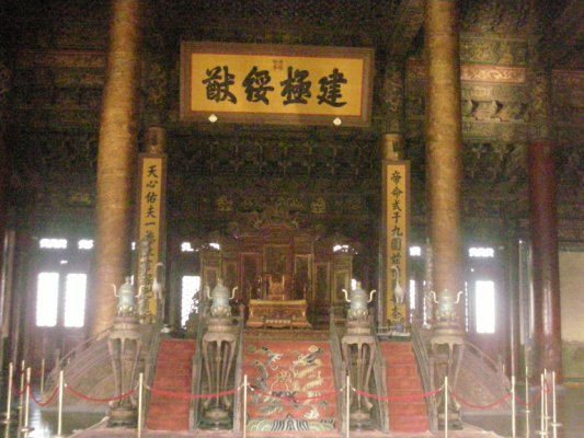 (映画「ラストエンペラ」のラストシーンの中に、平民となった溥儀が故宮に観光に訪れ、そこで出会った男の子に宝座の後ろに隠してあったコウロギを見せるという場面がありましたね。玉座の上には大きな玉が吊るされており、皇帝以外や皇帝に適さない人物が座ると落下し、頭をかち割るという言い伝えがあります。辛亥革命後の1916年に「皇帝」を自称した袁世凱は、この言い伝えを恐れてわざと玉座をずらして座っていたようです。)