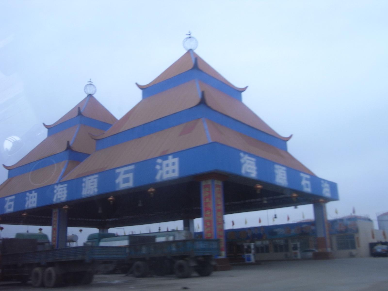ガソリンスタンド兼ドライブイン。屋根が中国の歴史の建物風ですね。トイレは、、敷居がない所謂ニーハオトイレ。恥ずかしかったです。