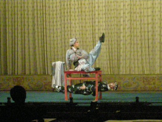 甲高い声と独特の??という独特の顔全体を塗り潰した化粧法が特徴的です。??の色によって役柄が決まっており、「赤」は必ず関羽です。また、一人だけおとぼけ役がいて、面白いメイクをしているので、すぐに分かります。