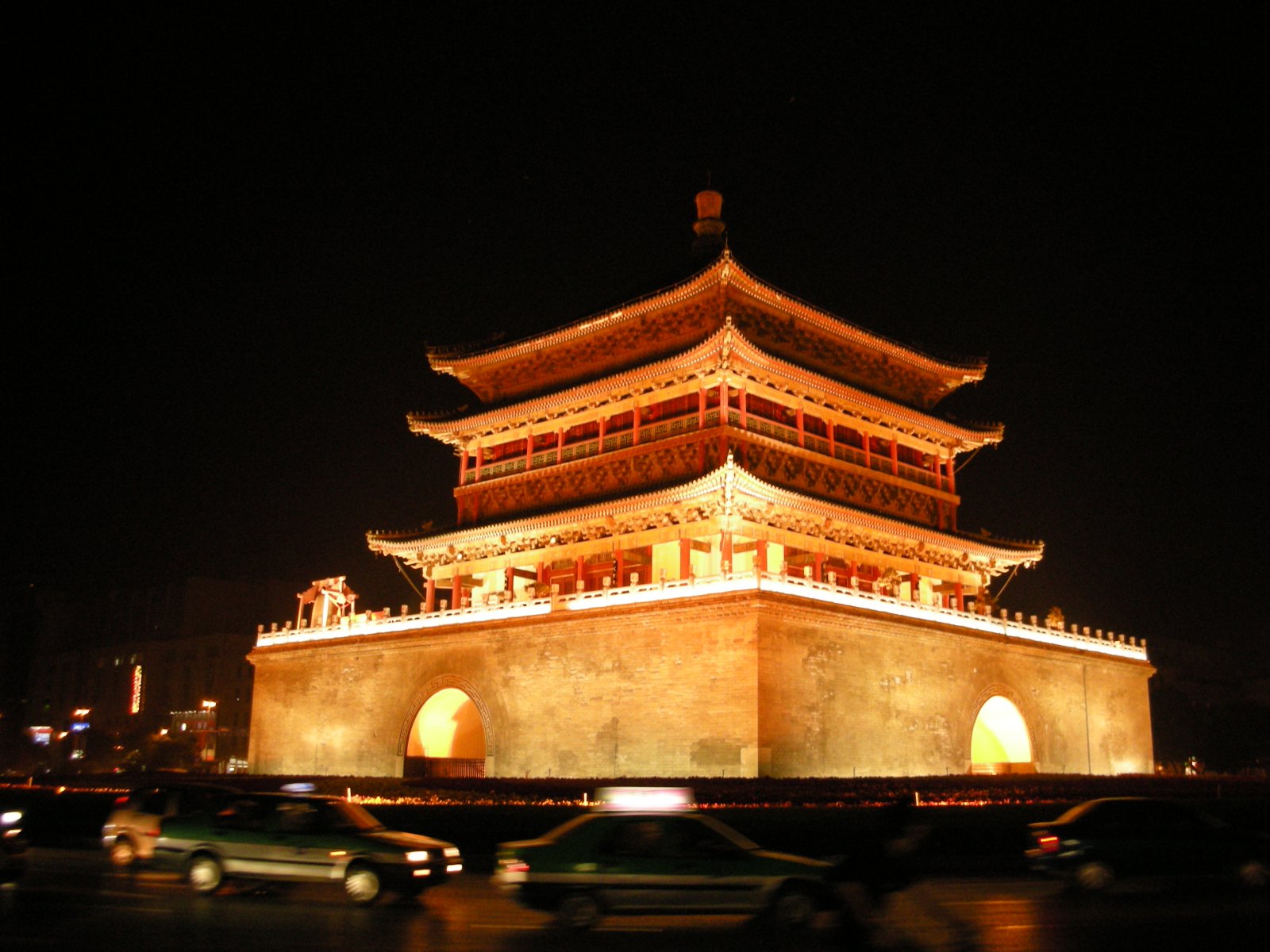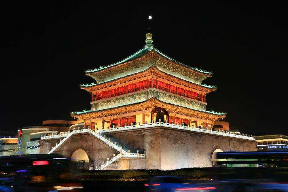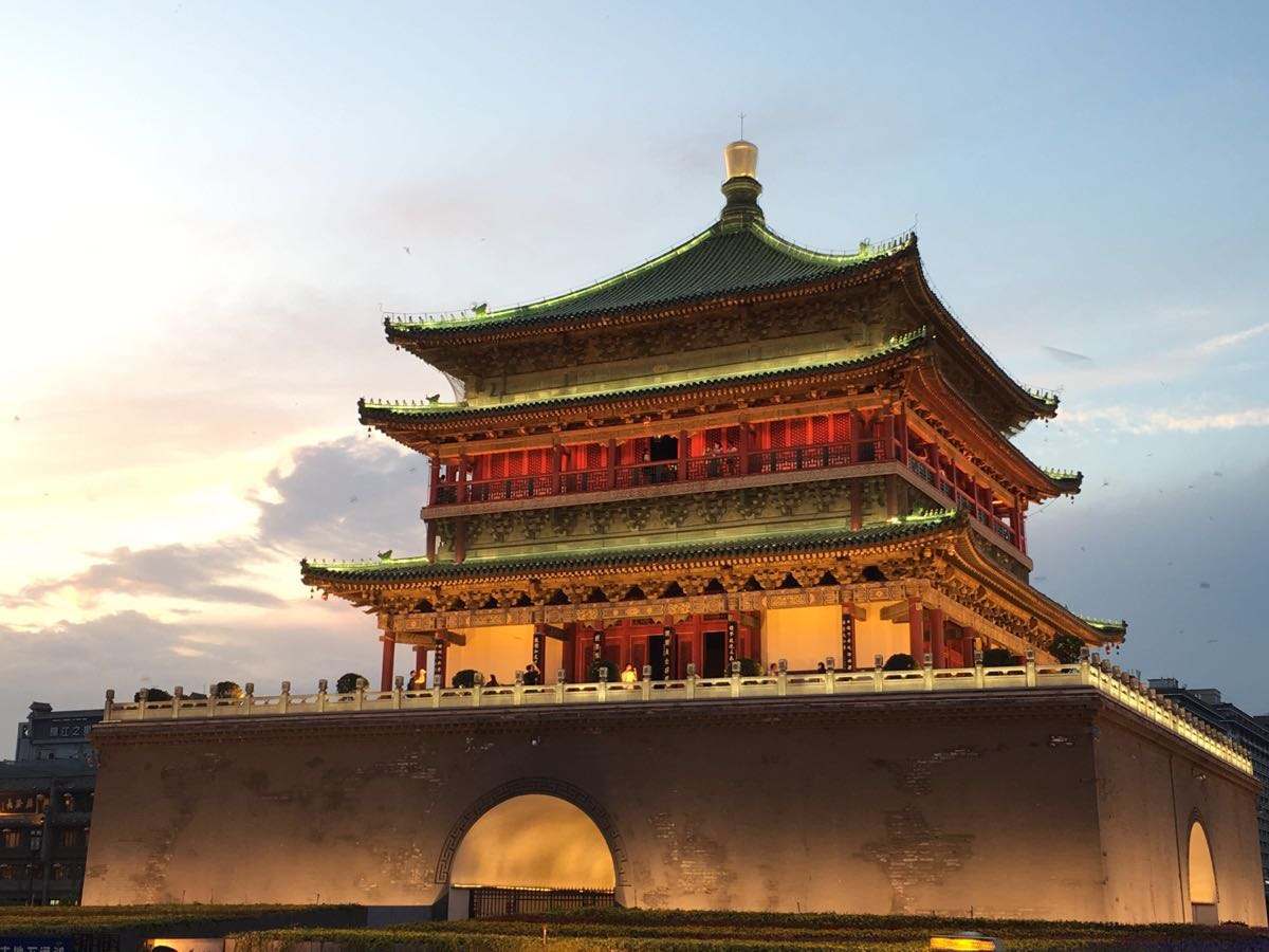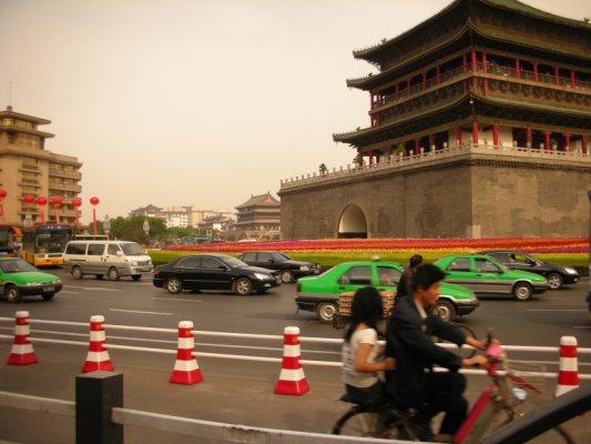 西安の鐘楼で市内の中心にあり、 城壁内を東西南北に走る大通りのその交差点の真ん中にある木造建築です。かつて明の太祖朱元璋が、西から長安に向かう龍の夢を見ました。その龍は巨大なライバルの出現を意味していると占いに出たことから、龍を鎮めるために建てられたのが、鐘楼の由来であります。外側からみると三階建てですが、中に入ると二階建てという構造で、釘を一本も使わず、一本木で建てられています。かつて鳴り響く大鐘が朝を告げ、その鐘の音を聴きながら、役人たちは宮廷へ向かったといいます。重要な歴史遺産なのです。