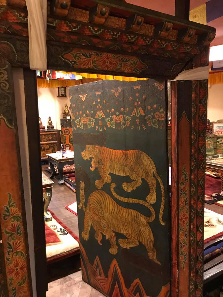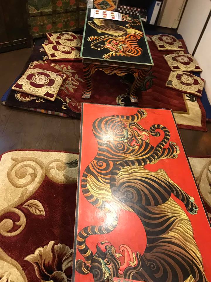 (テーブルにも虎や龍等が描かれたチベット仏教美術が見られます。)