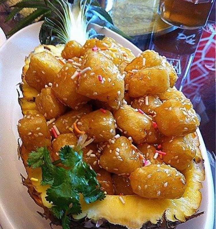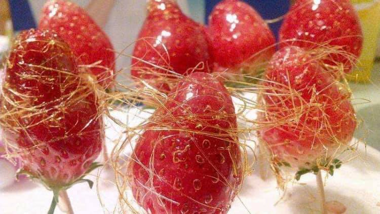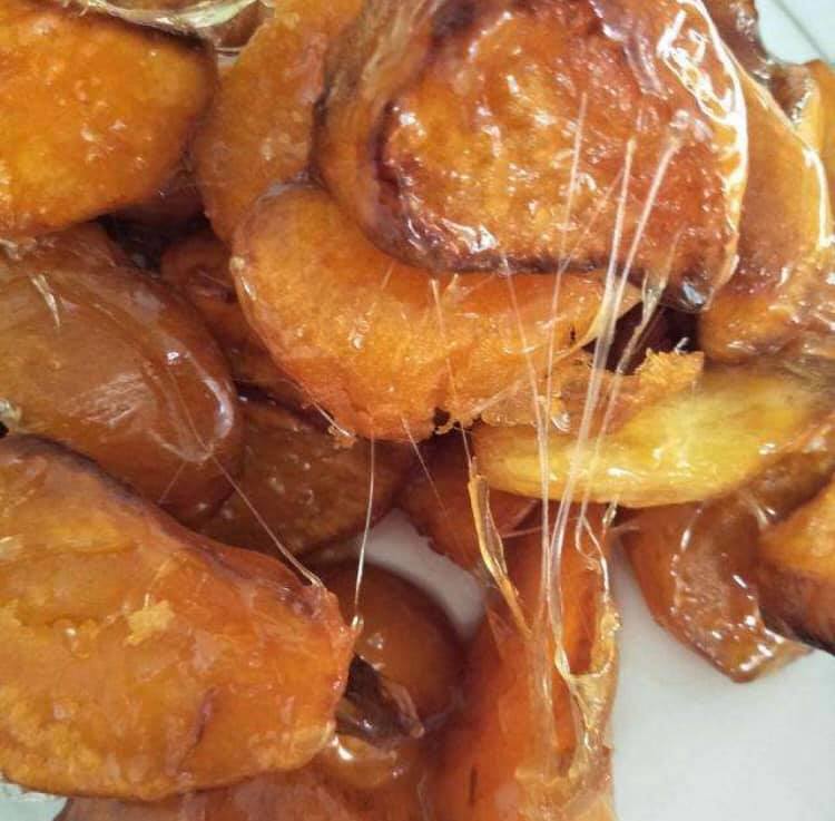 抜絲は飴をドロドロの状態で水分を抜いた状態でかけるため、糖度が高いため、日本の大学芋より表面がカリカリとして甘いのです。これを応用してバナナやイチゴを材料に使われる"拔?シリーズ"がたくさんあります。