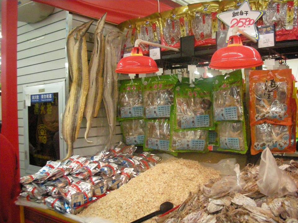深センの多くのスーパーでは南方地方のため、果物の王様であるドリアンと香辛料の匂いが店内中に漂い、また水族館さながらの海鮮の種類の多さに圧倒されてました。また丸ごとそのままの形で吊るされたブタや鶏を見ると、食文化の違いを感じました。