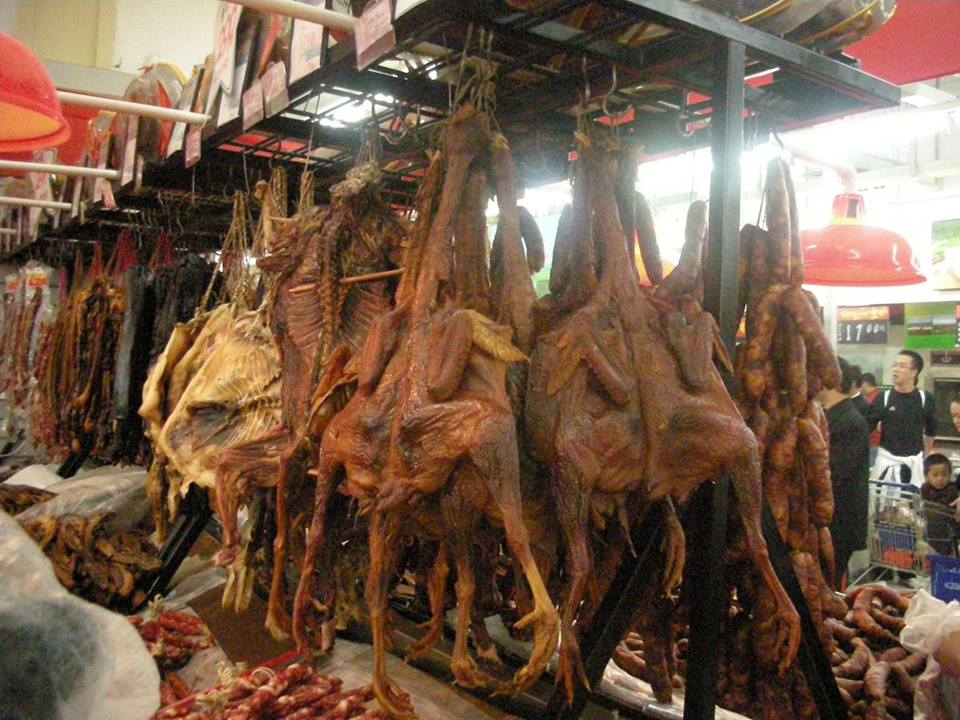 (鴨の丸焼き!日本と違い顔つきがほとんどです。食文化の違いですね。)
