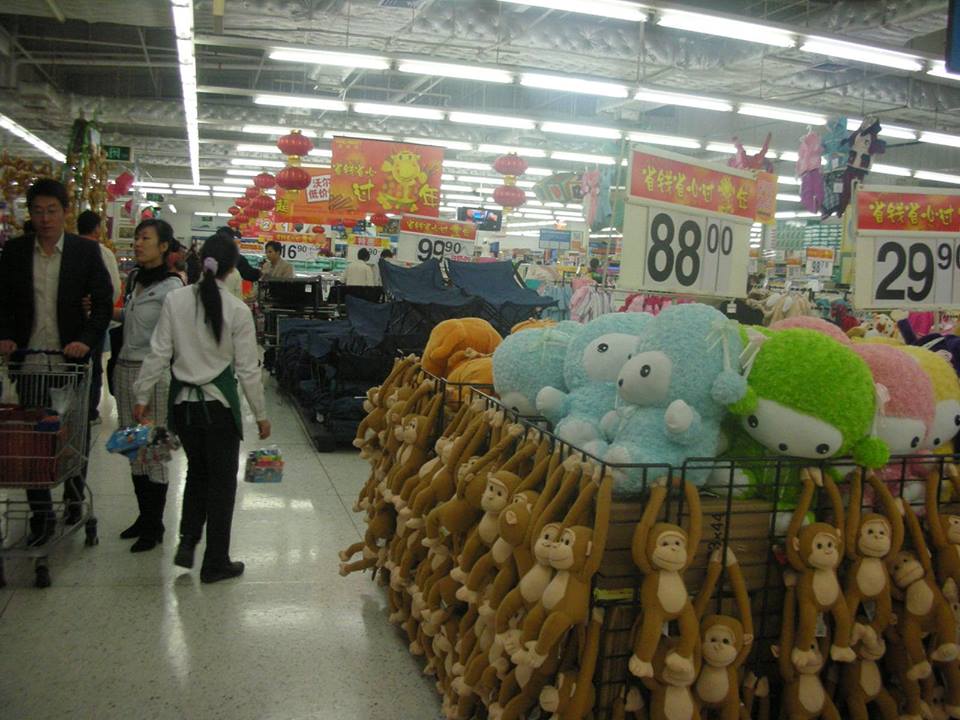 中国のスーパーは万引き防止のため、入り口に荷物預かりのコインロッカーに荷物を預けてから、二階へのスロープを上がってから買い物が始め、一階に戻るという形態が多かったです。また山のように盛られた巨大なキュウリやナス等を量り売りでは物を触りながらその質感を感じてショッピングを楽しむことができました。