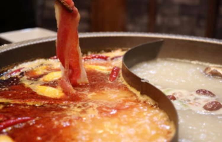 太極図の形に仕切られた鍋に赤いスープと白いスープが入っていて、羊肉を中心とした具材をシャブシャブして食べるものです。白いスープ(白湯)は鶏、豚骨や野菜などで、紅いスープ(麻辣湯)は白湯をベースに、麻(山椒)、辣(唐辛子)などの香辛料と漢方を入れたものになります。