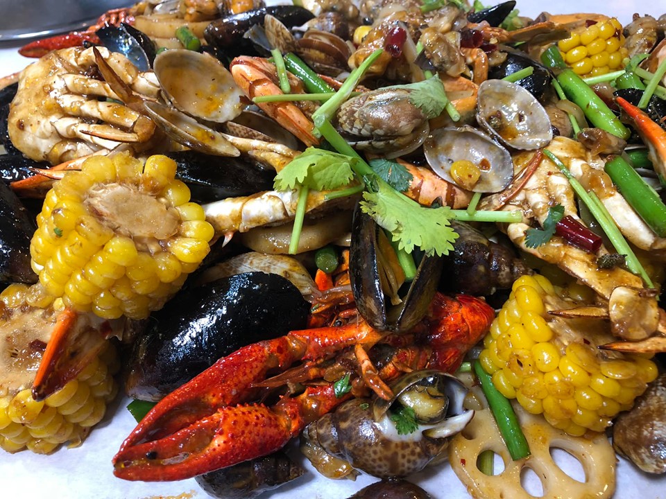 大東北の名物料理、海鮮全家福はたくさんの海鮮物を麻辣な味付けし、鍋で炒めたものを大きなスコップですくい、紙シートの上に広げて食べる豪快な料理です。最近中国でも大人気となった食べ方がそのまま味わえます。『本海鮮はホタテなどの貝類、カニ類が中心でトウモロコシ、レンコン、ニンニクの芽にパクチーなどの野菜も豊富に入っています。