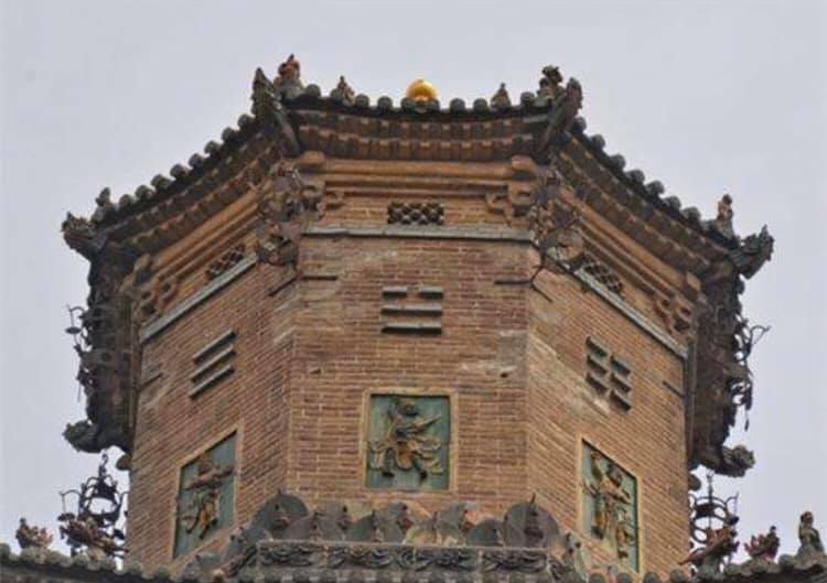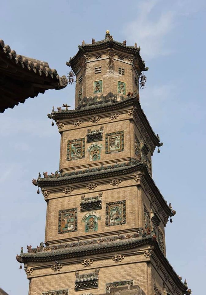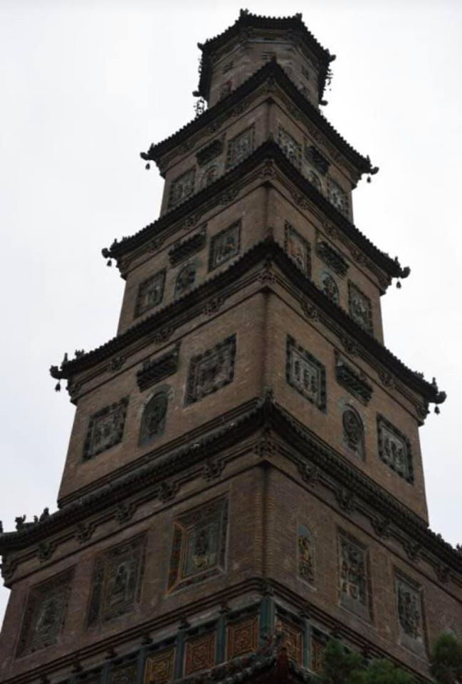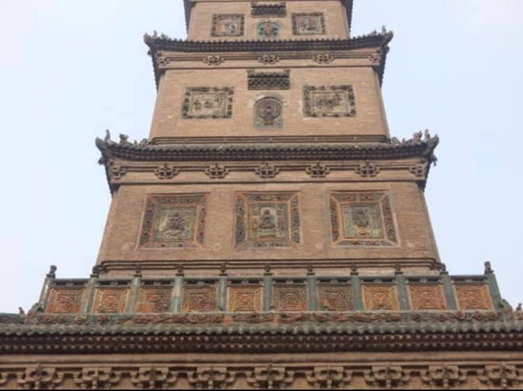金頂瑠璃宝塔は、六層構造で高さ約30メートルあります。一番下の第一層から第五層までは正方形ですが、最上層の第六層は八角形になっています。第二層から上には沢山の仏教にまつわる図柄が描かれています。