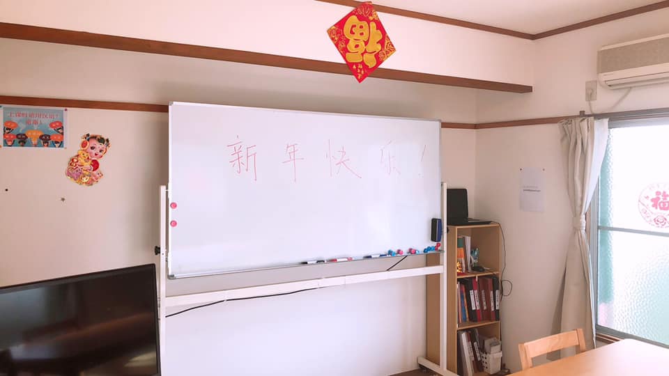 スマイル中国語教室では教室内に上聯"好運来吉祥如意(幸運でめでたい事が思うがままに叶う)"、下聯"福星照富?平安(幸運が訪れ、富や豊かさがもたらされ、家内安全であること)"、そして横批"財源広進(お金が広く入ってくること)"を貼り付けました。