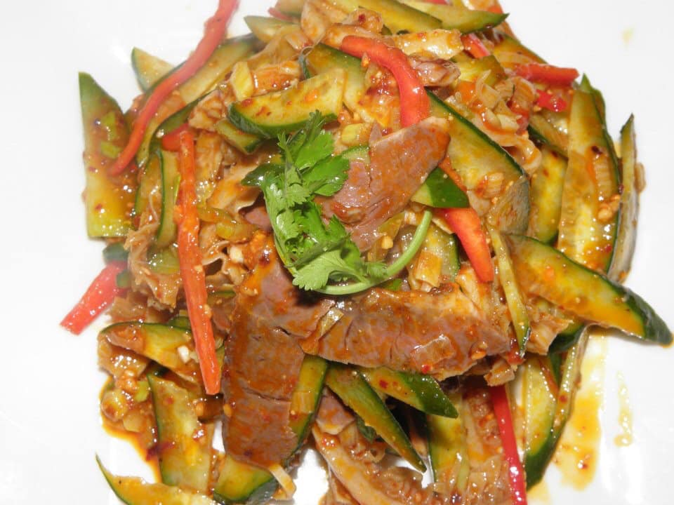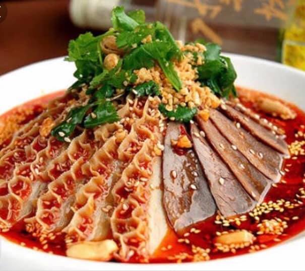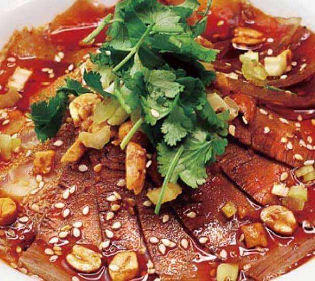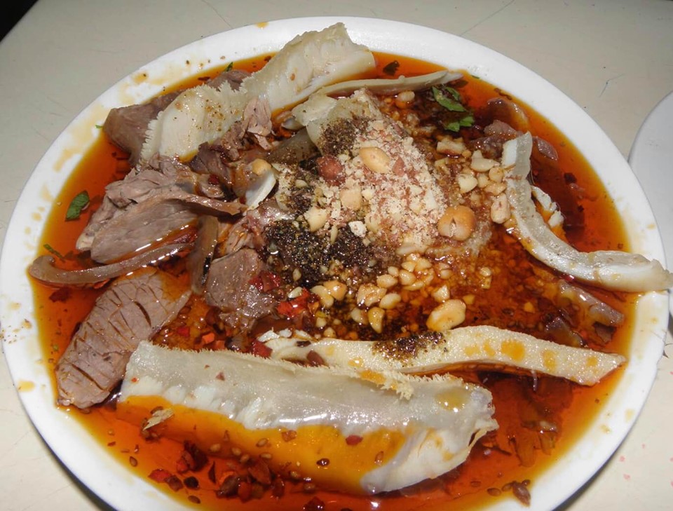 (成都の有名なシビレるような辛さの美味しい料理「夫妻肺片」です。牛の頭の皮、心臓、舌、レバー、そして胃袋などを使います。)