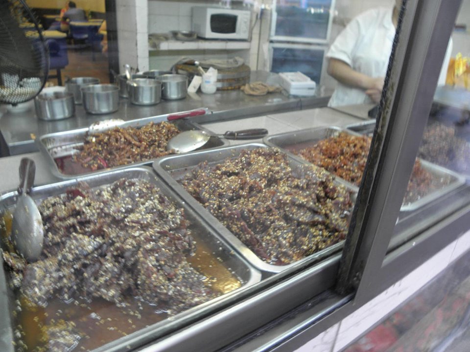 (店頭には煮込んだ牛の頭の皮、心臓、舌、レバー、そして胃袋などが並べられています。)