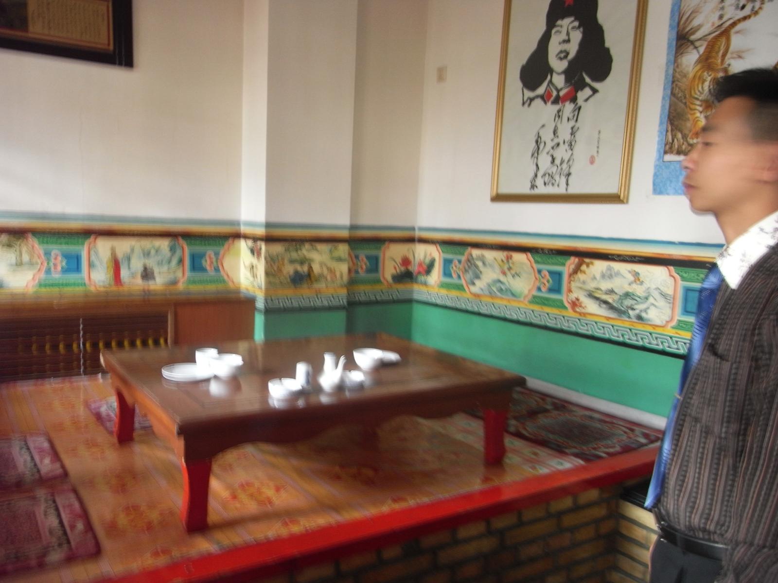 (店には中国の寒い季節で見られるオンドルがあります。オンドルとは床下に水平坑を作り,その上に石をのせ土を塗り,さらに油紙を目張りして煙道とし,その一方のたき口から火をたいて室内を暖めるものです。)