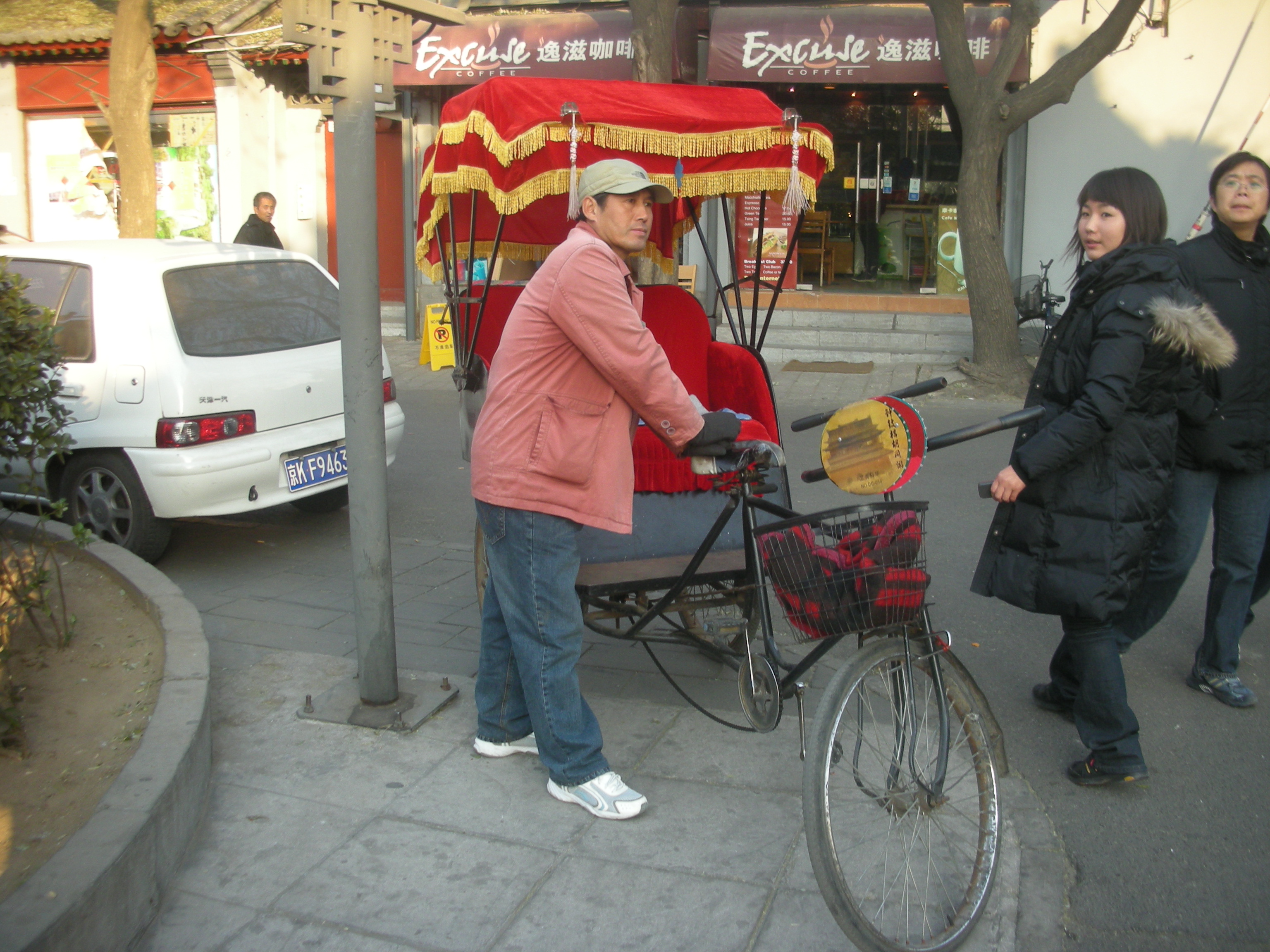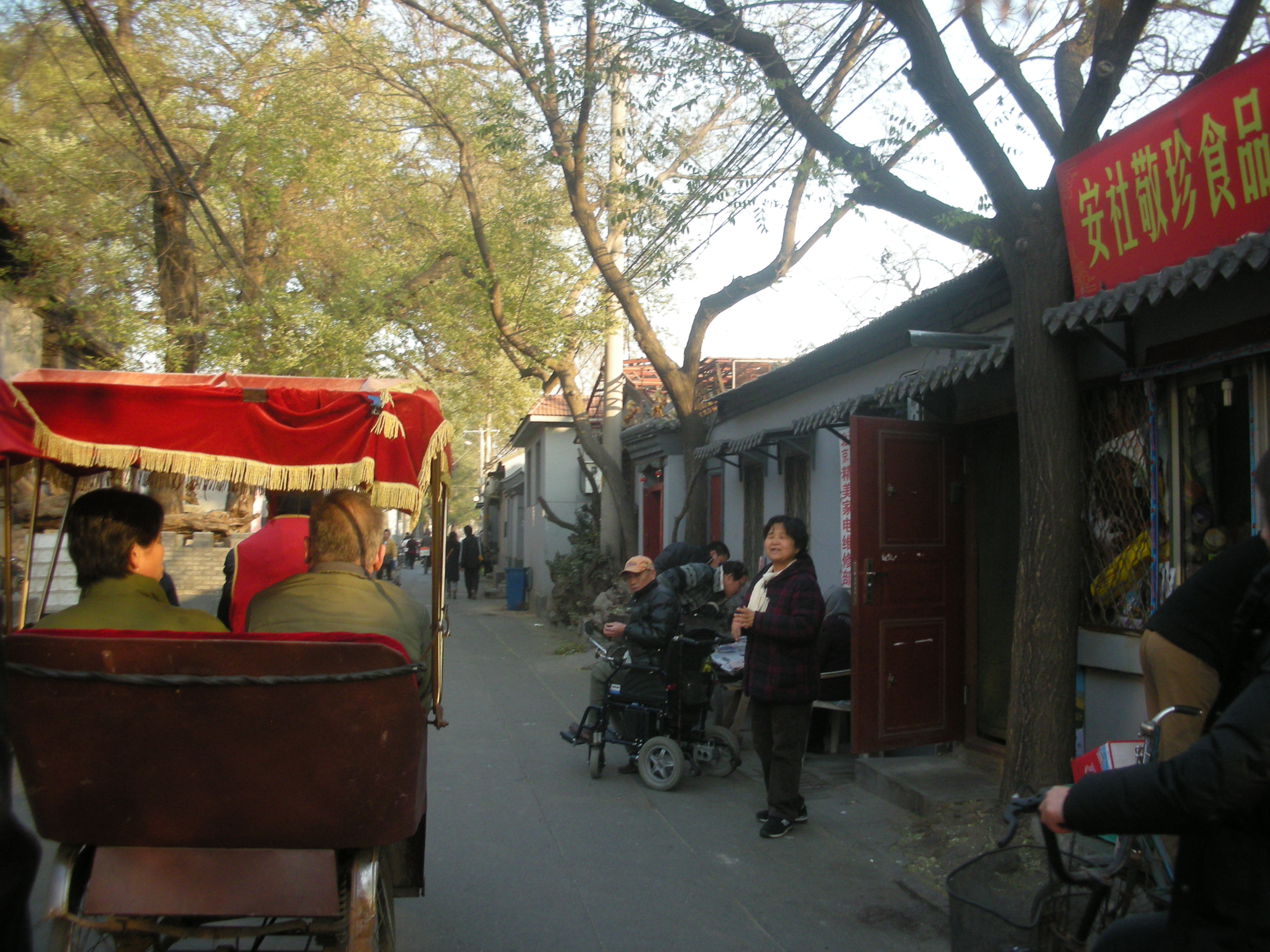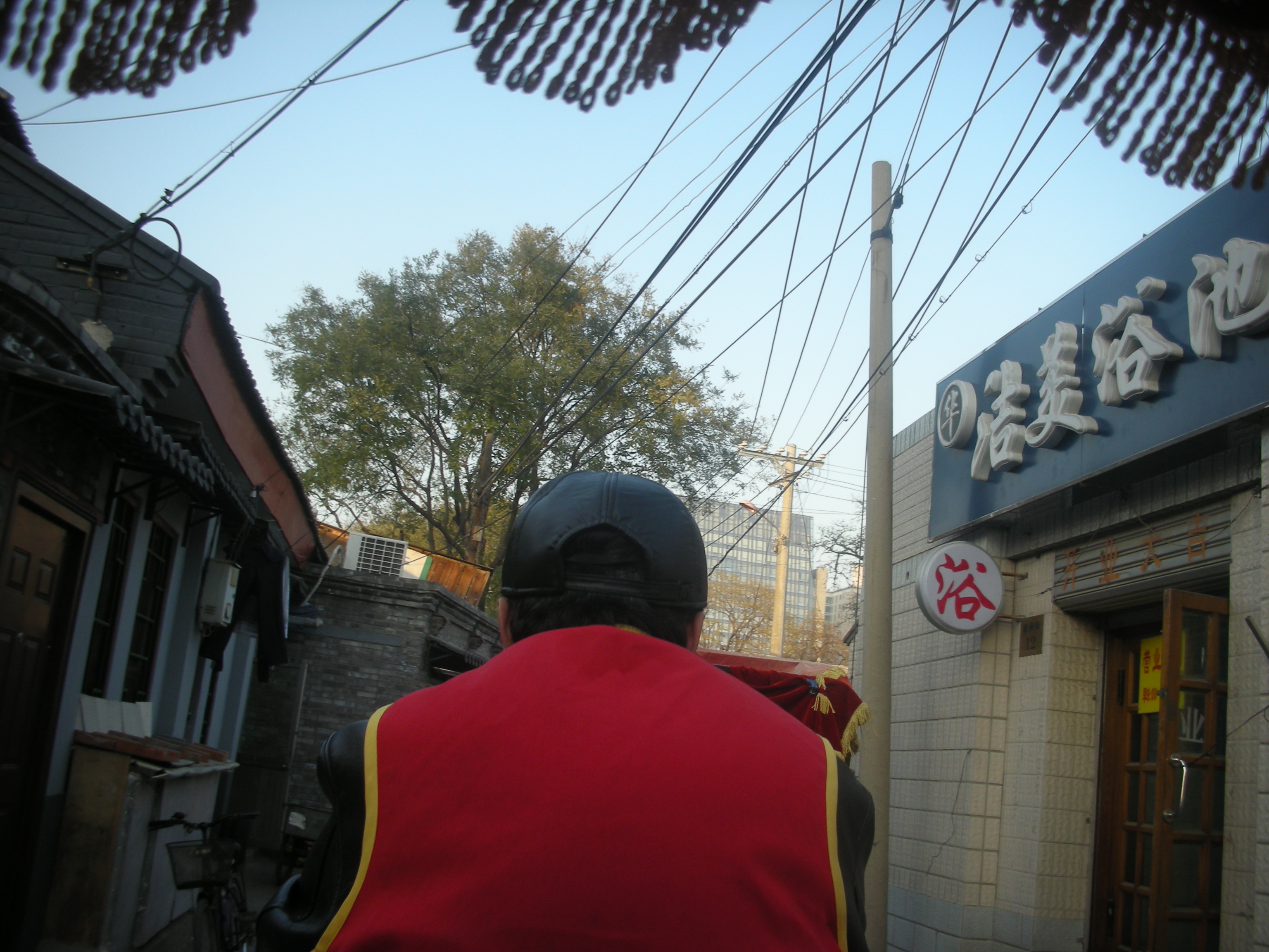 (胡同の路地を人力車で移動します。)