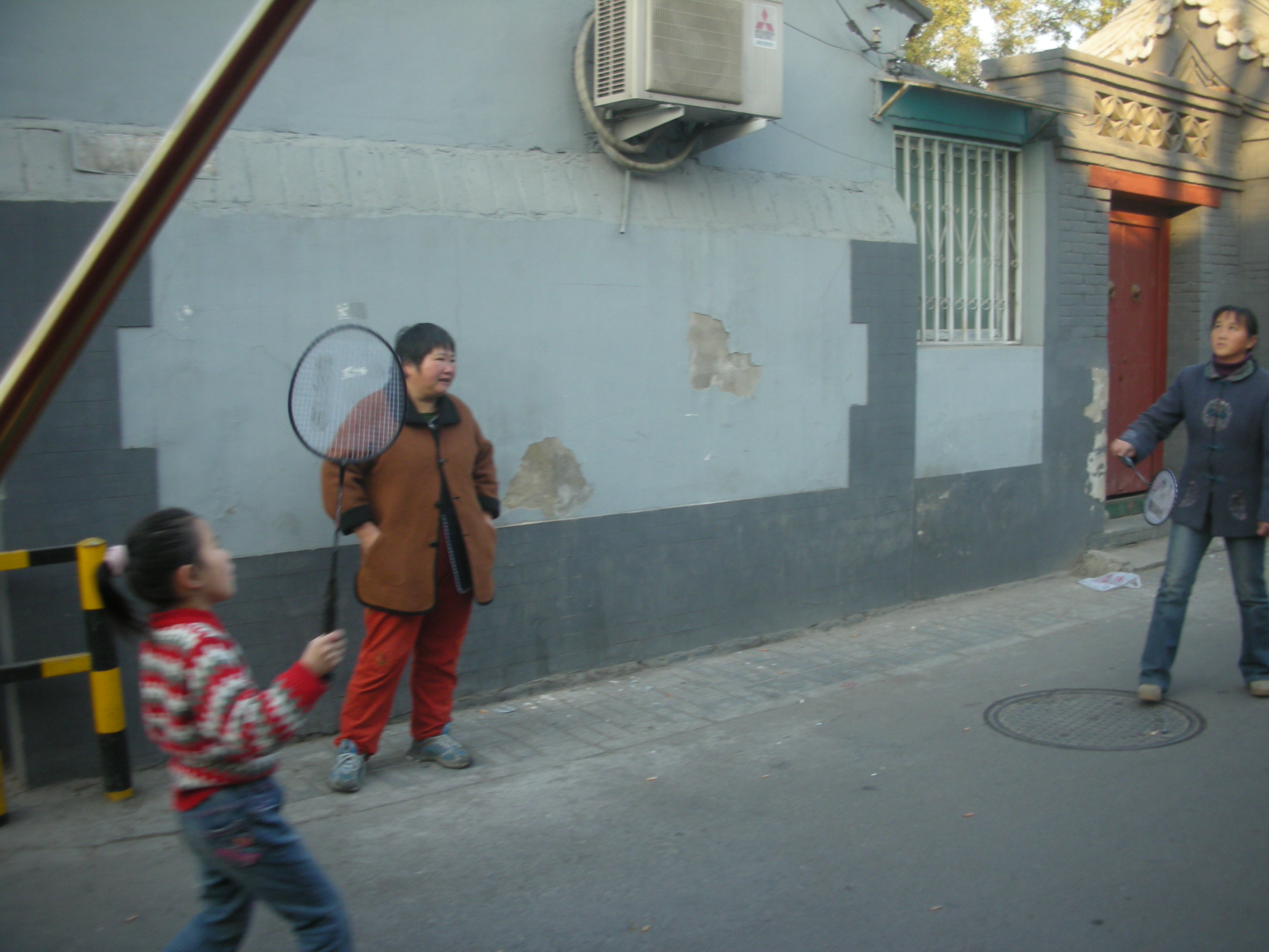 (胡同の路地で遊ぶ人々。)