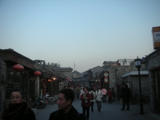 (四合院作りの住宅が並ぶ路地。モンゴル軍を防ぐために窓を作らず、外壁で囲んで中庭を造るようにした造り。)