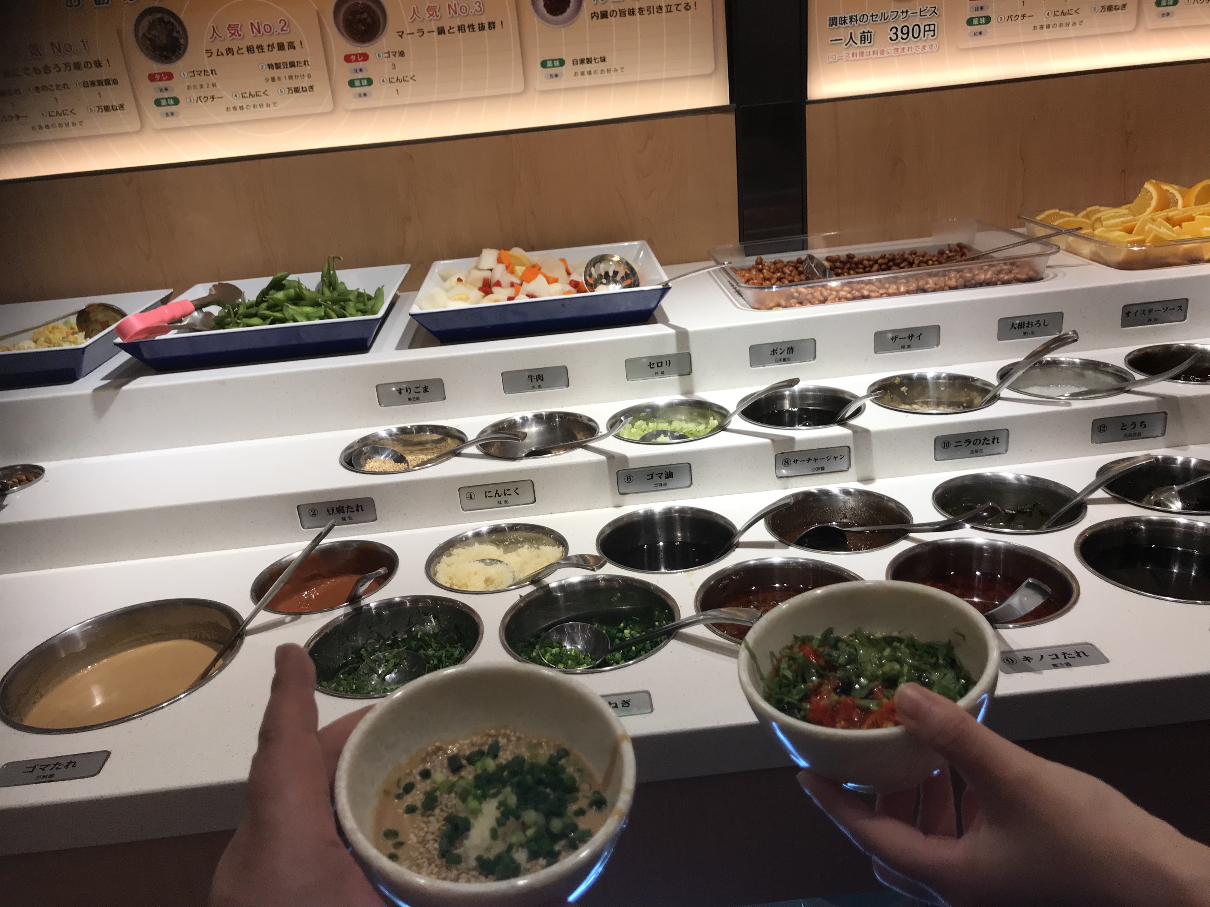 ゴマだれなどをベースにピーナッツ、パクチー、ネギ、ニンニクなどいろんなものを好みで入れられます。
