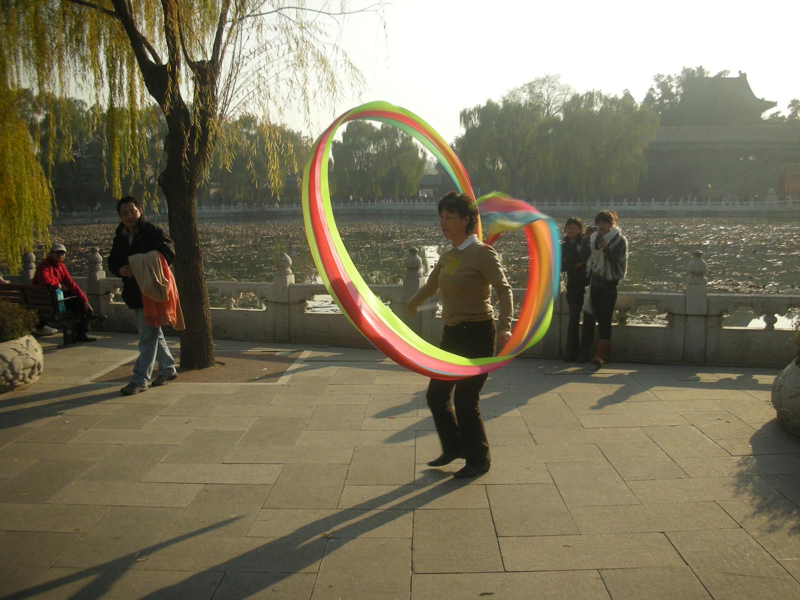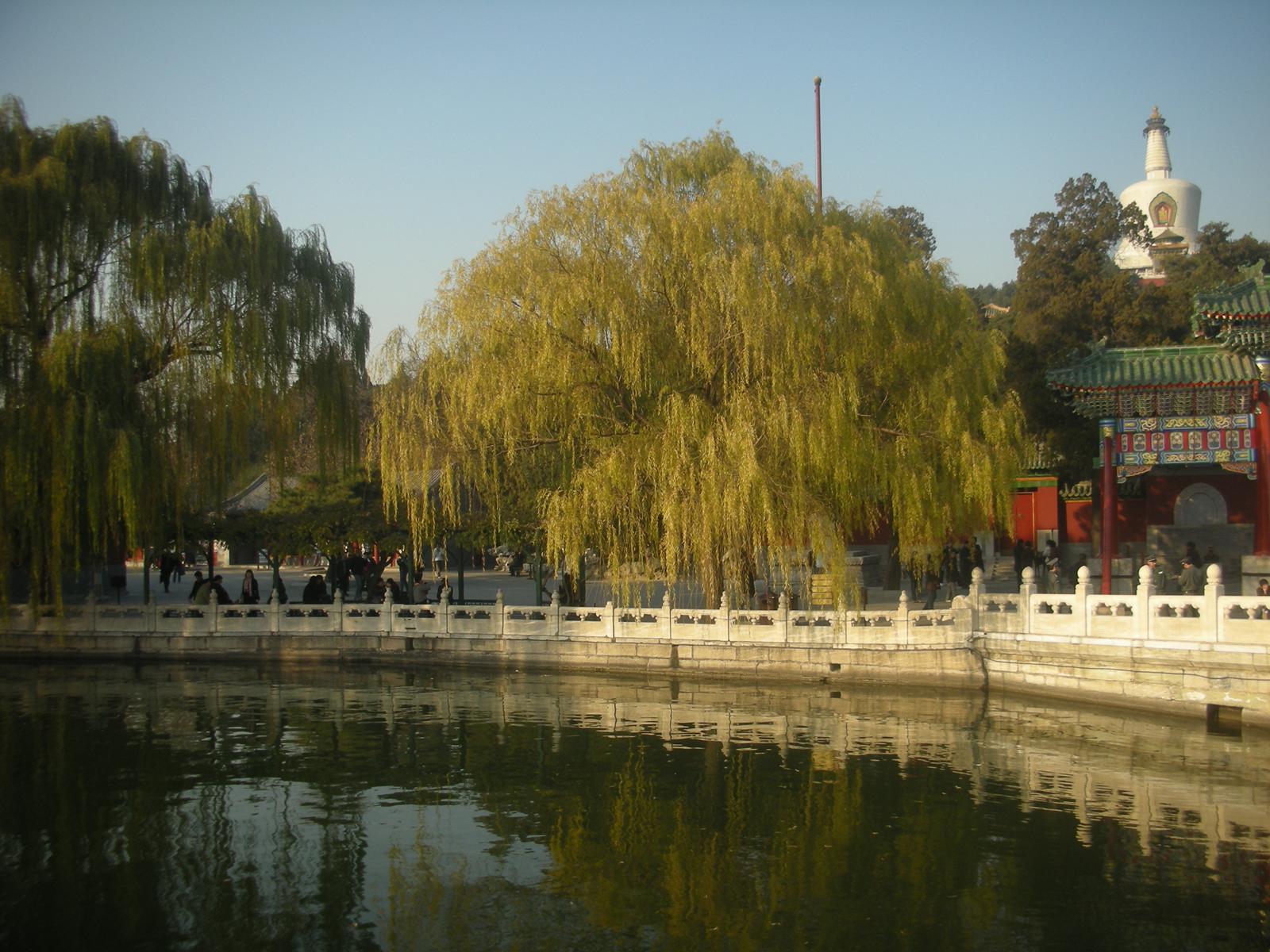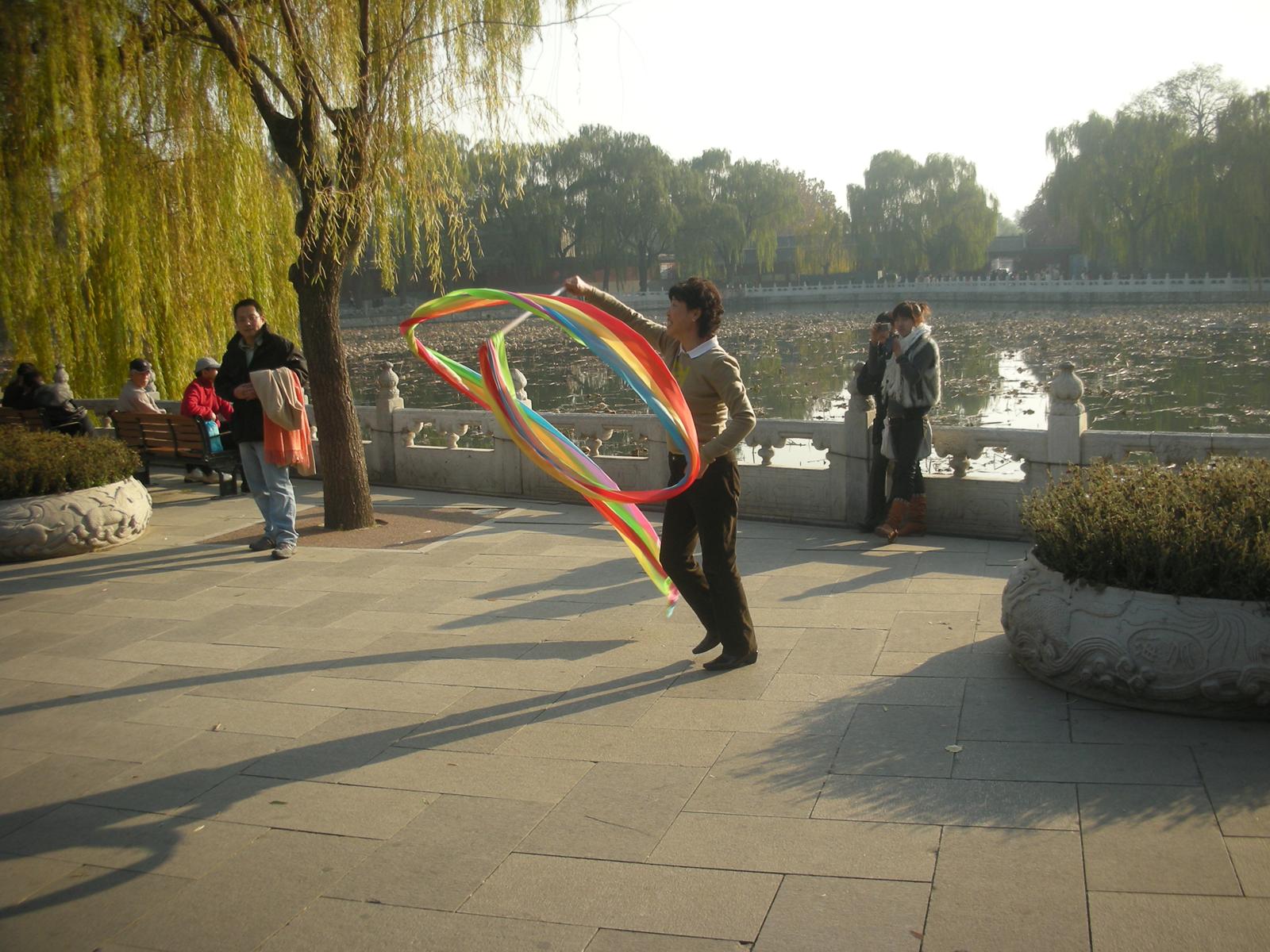 北海公園は現在開放され、地元の中国人の憩いの場所となっており、釣りを楽しむおじいさんやピクニックをする家族連れがいるかと思えば、新体操のリボンのような技を見せる人や、太極拳をしたり、歌を歌ったり、地面へ水を筆につけて書道をする人もいたり、ダンスを披露したりする人の姿も見られます。更に冬にはスケートリンクが開放されます。北京市民の憩いの場所となっており、生活の一部となっているのです。