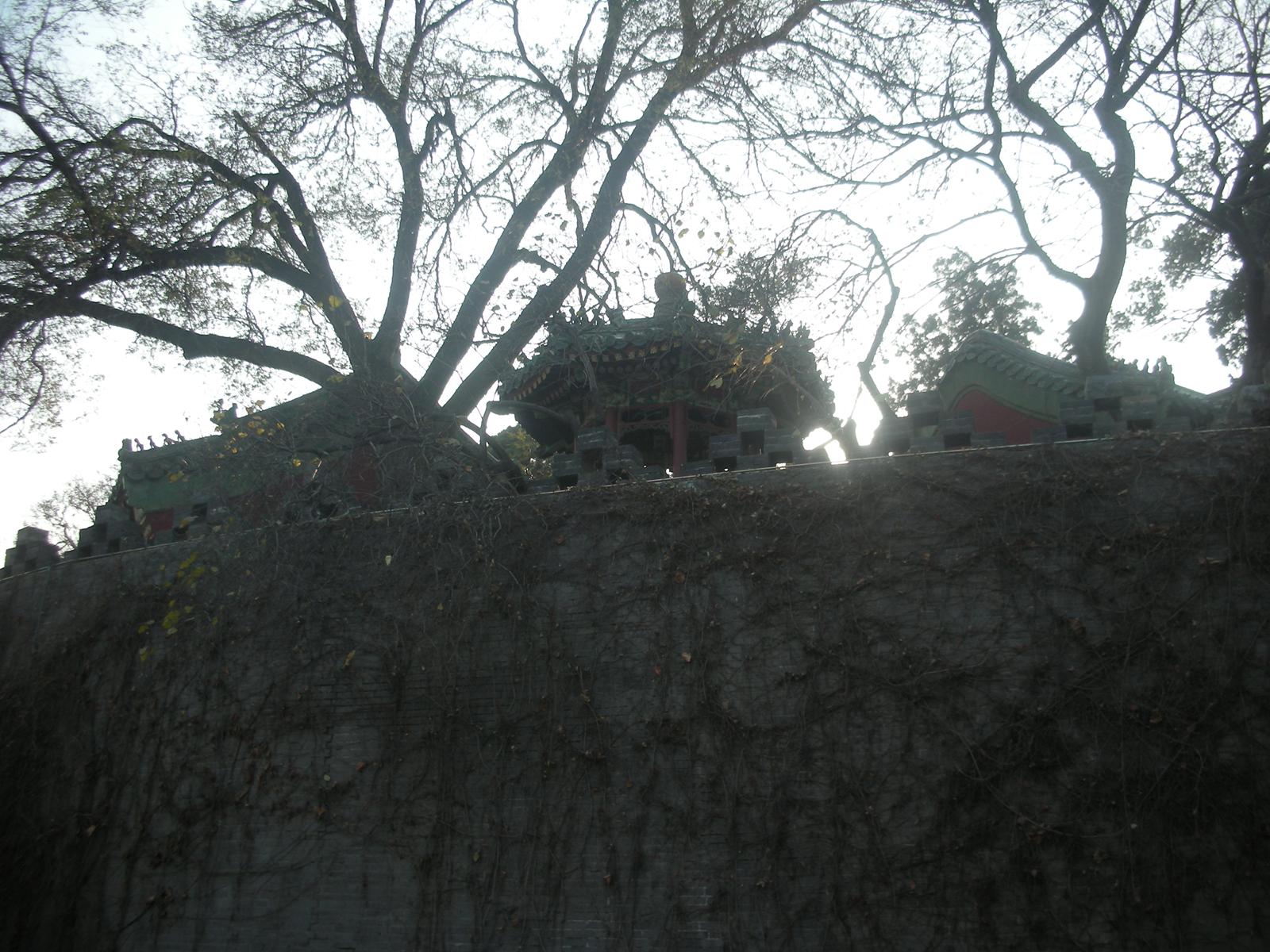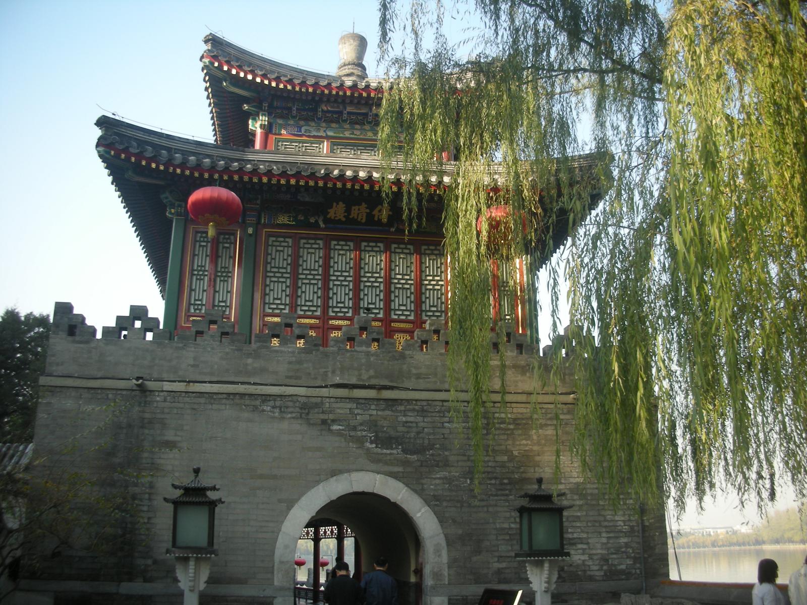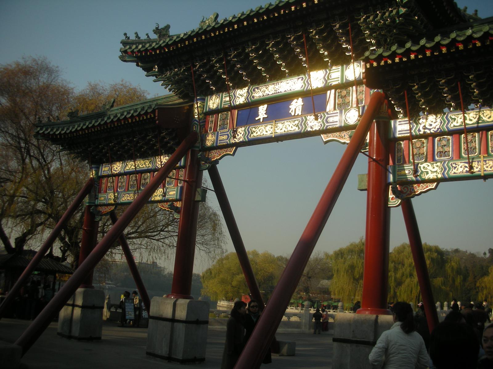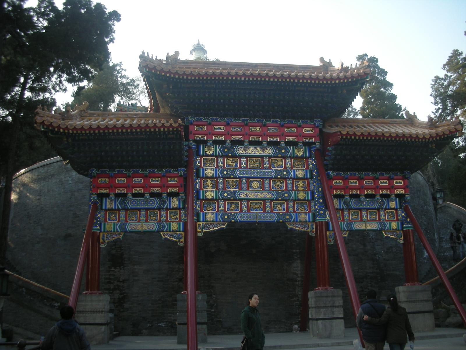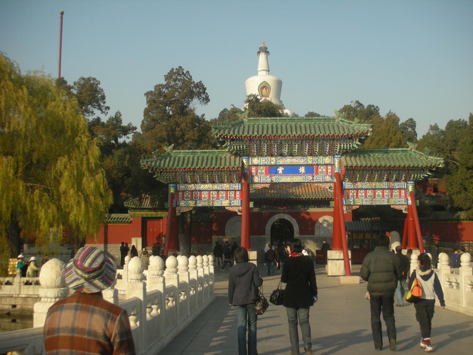 (永安橋を渡って瓊華島。正面、白塔。その前の永安寺というお寺の門。)