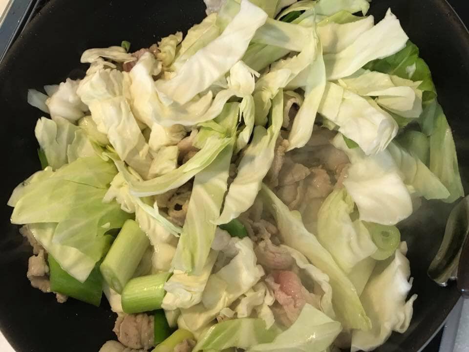 3、フライパンに油をひいて強めの中火で熱し、まずにんにくを炒める。次に豚肉を加えて炒め、色が変わったら、キャベツを入れて炒め合わせる。