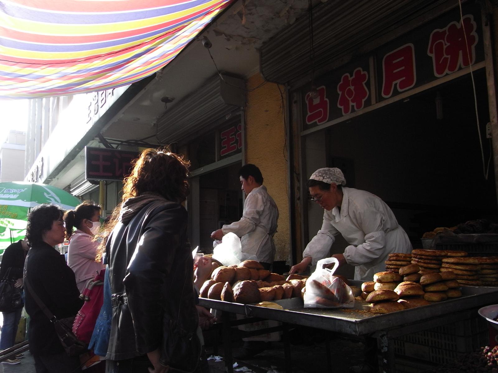 フフホトではササン朝ペルシャの銀貨が発見されており、中東のイスラム教国と古代より、交易があった都市であったことで知られています。その中でも、イスラム風情街はこの一帯はイスラム教徒の人口が比較的多い地区で回族区ともよばれています。この街にはイスラム系のアーチ型やビザンチン様式で装飾した建物がたくさんあり、異国の情緒があります。ここには内モンゴル自治区で人気のある伝統的なパン類や菓子が、多く出店していてイスラムグルメを満喫できます。