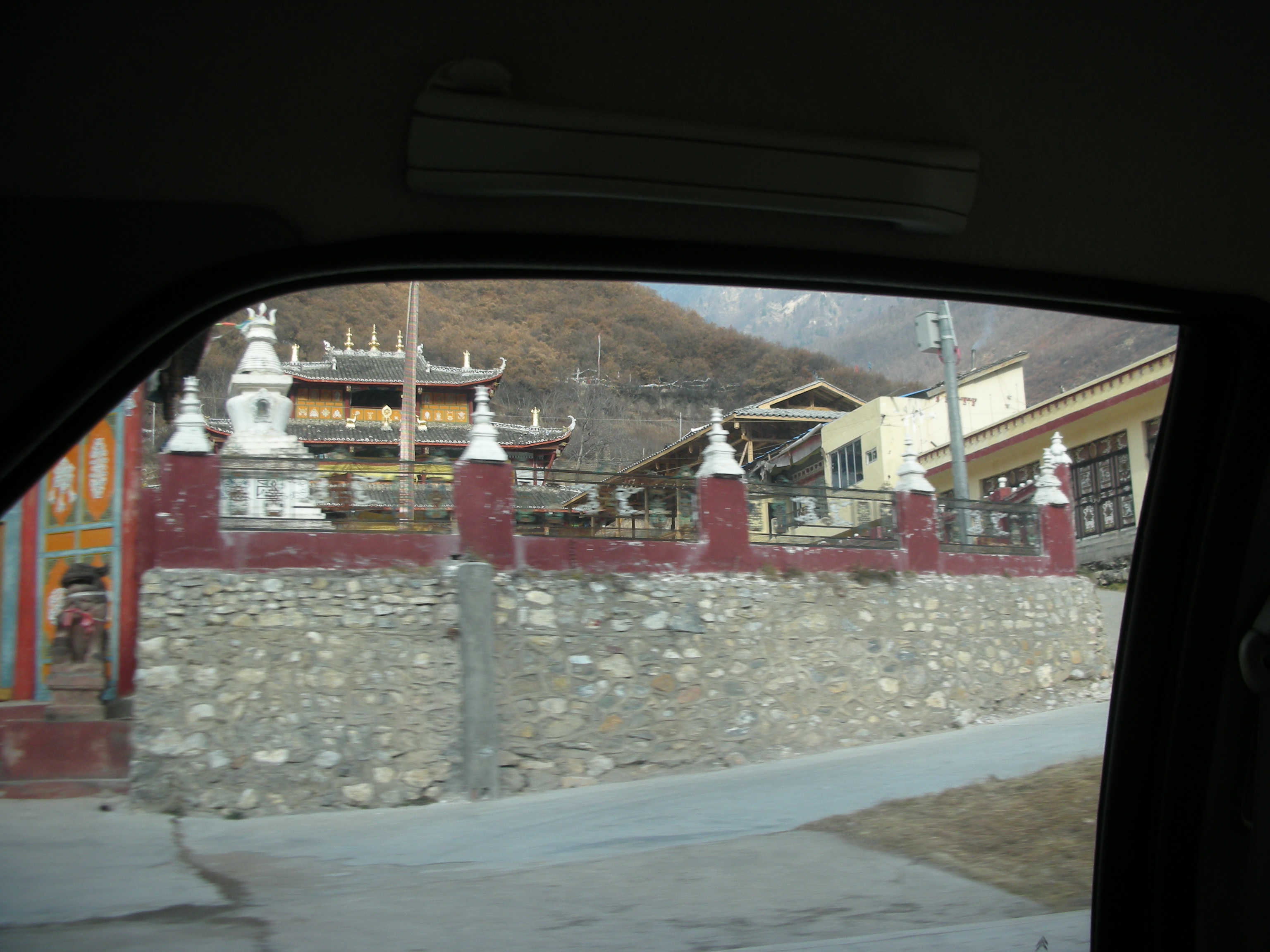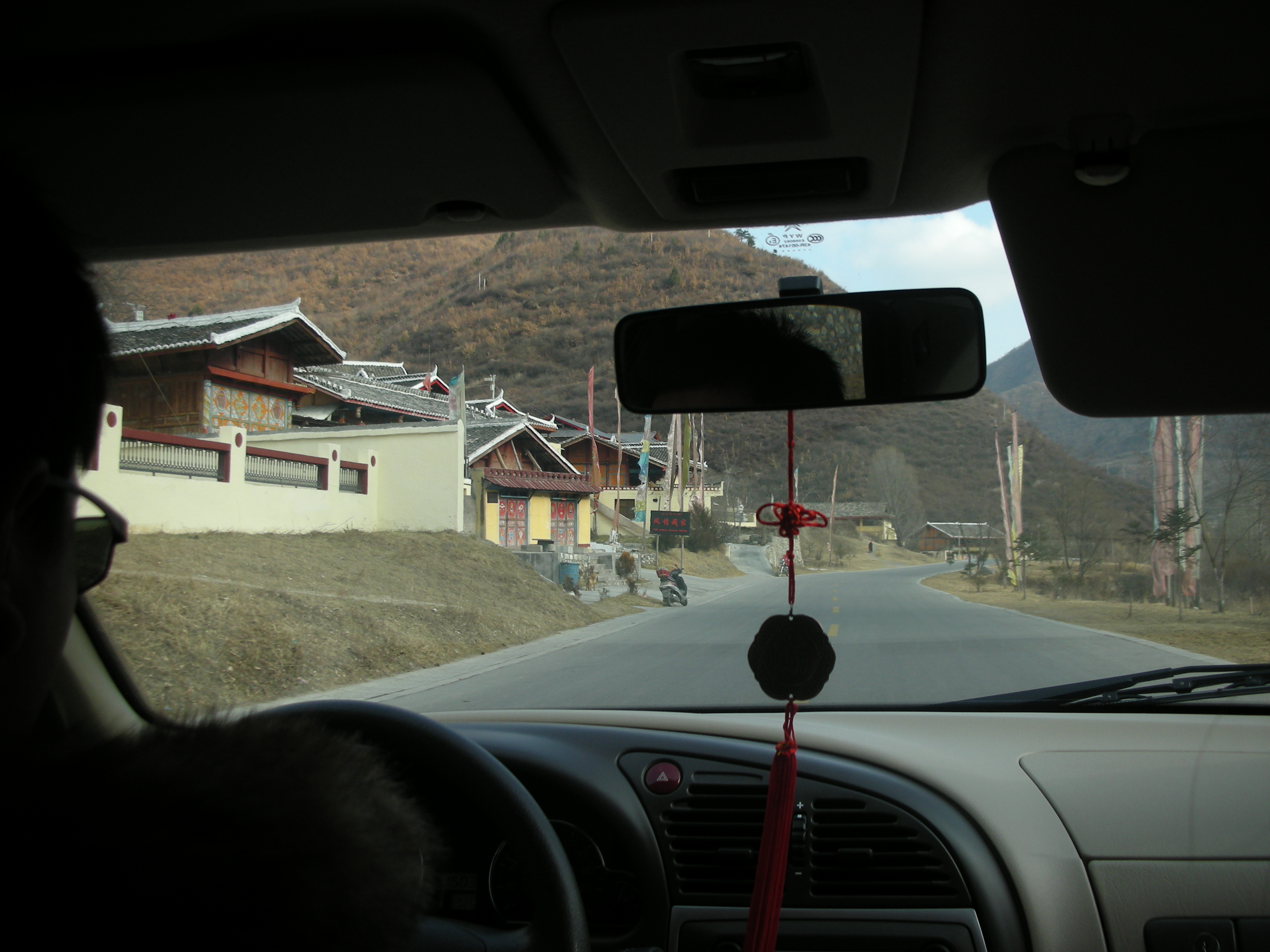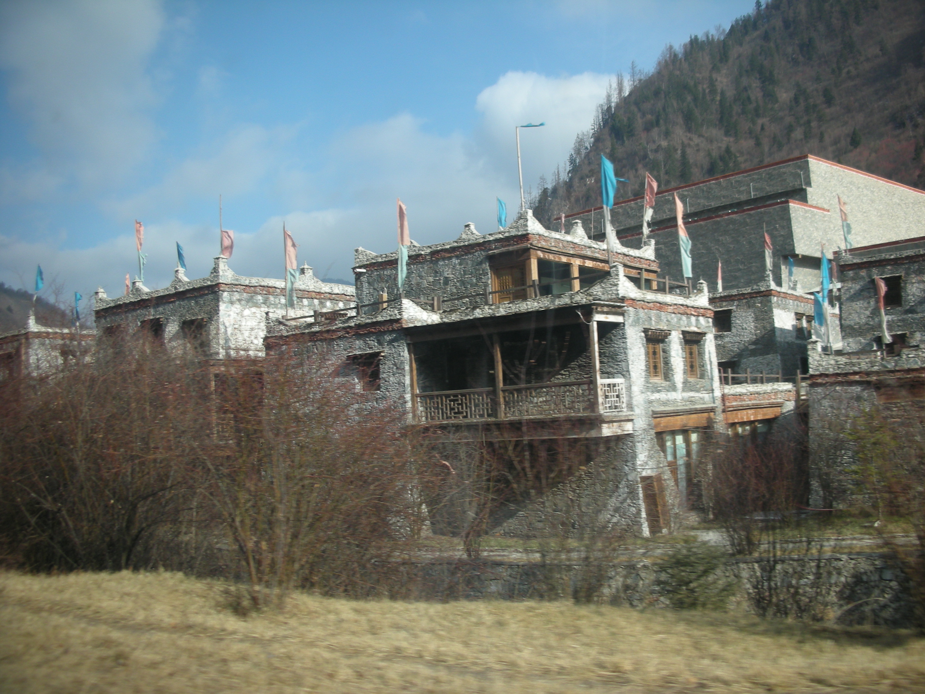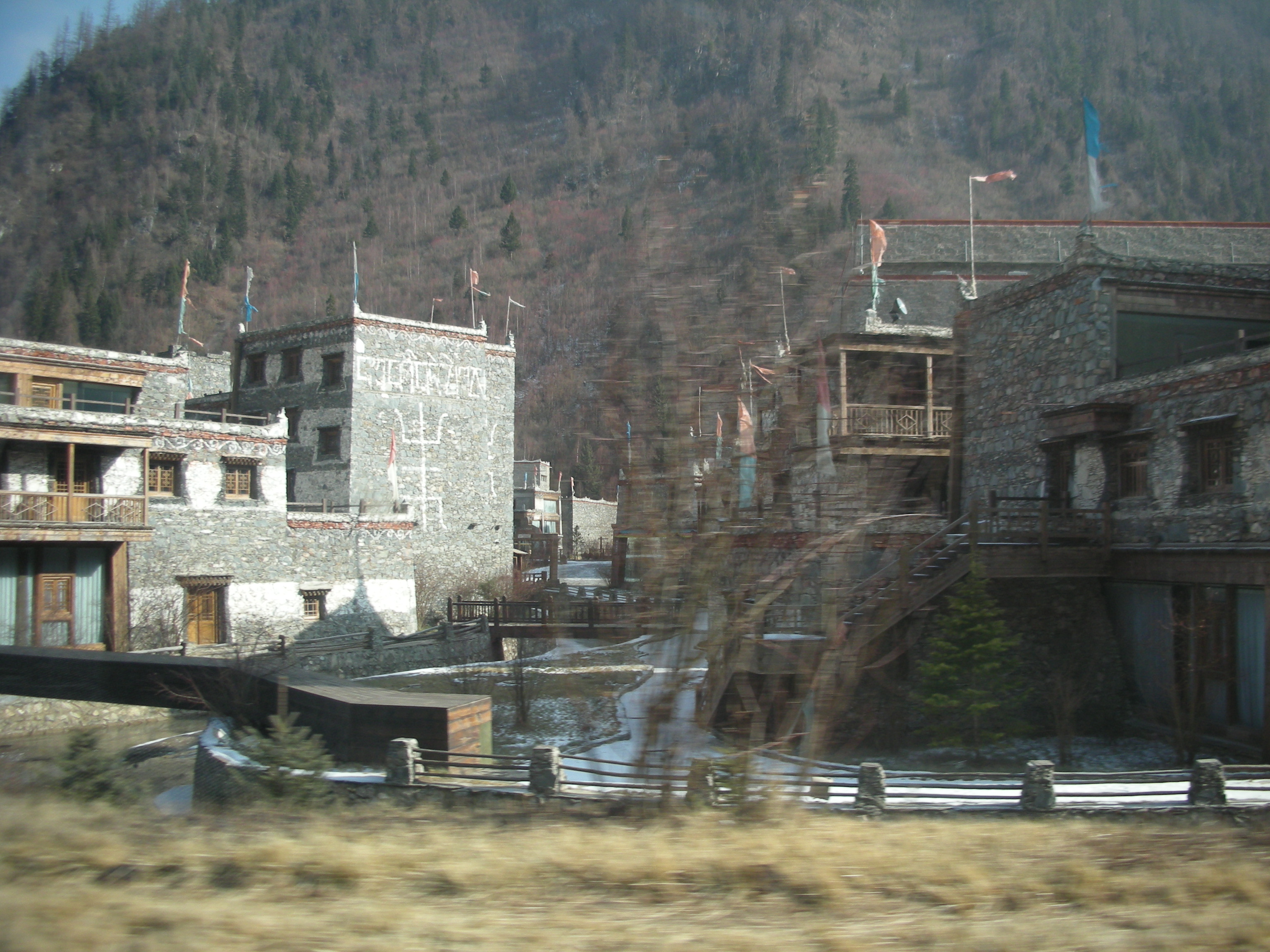 (車窓から見たチベット族の集落。どこか日本の農村の風景に似て見えます。)