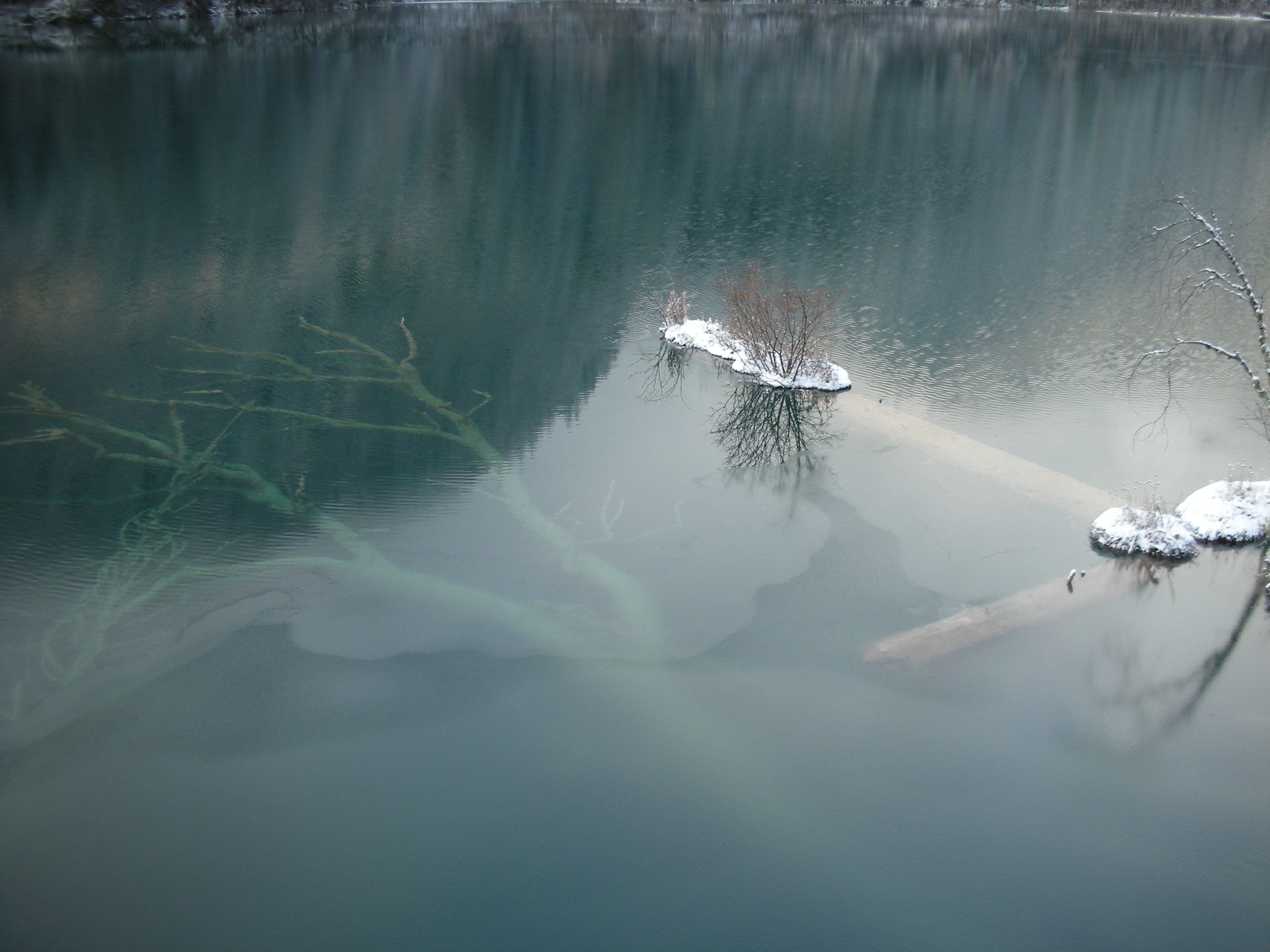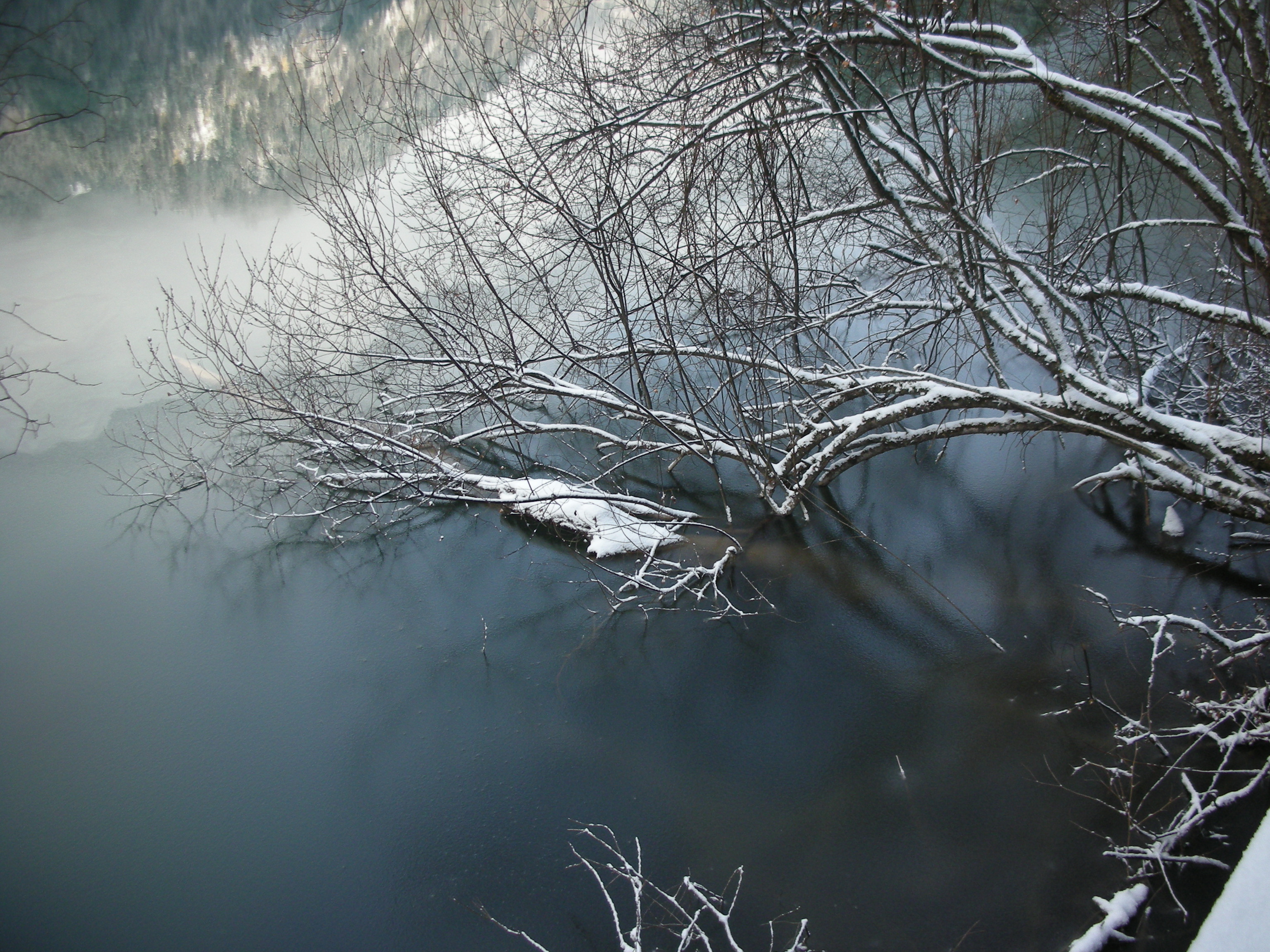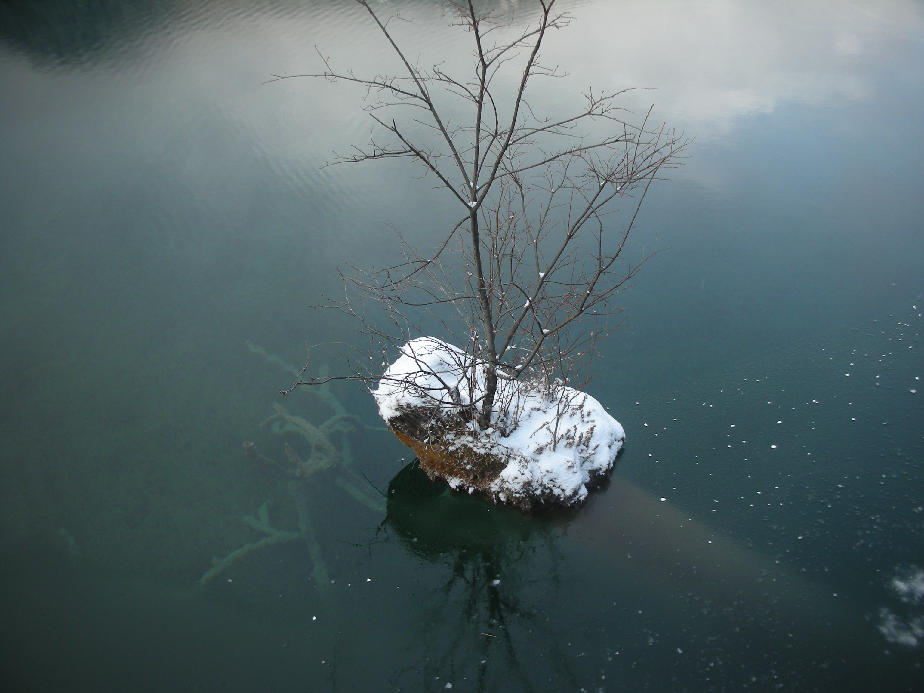 (湖面より飛び出た枝に雪が積もり、美しい自然の芸術品が出来上がっているようです。)