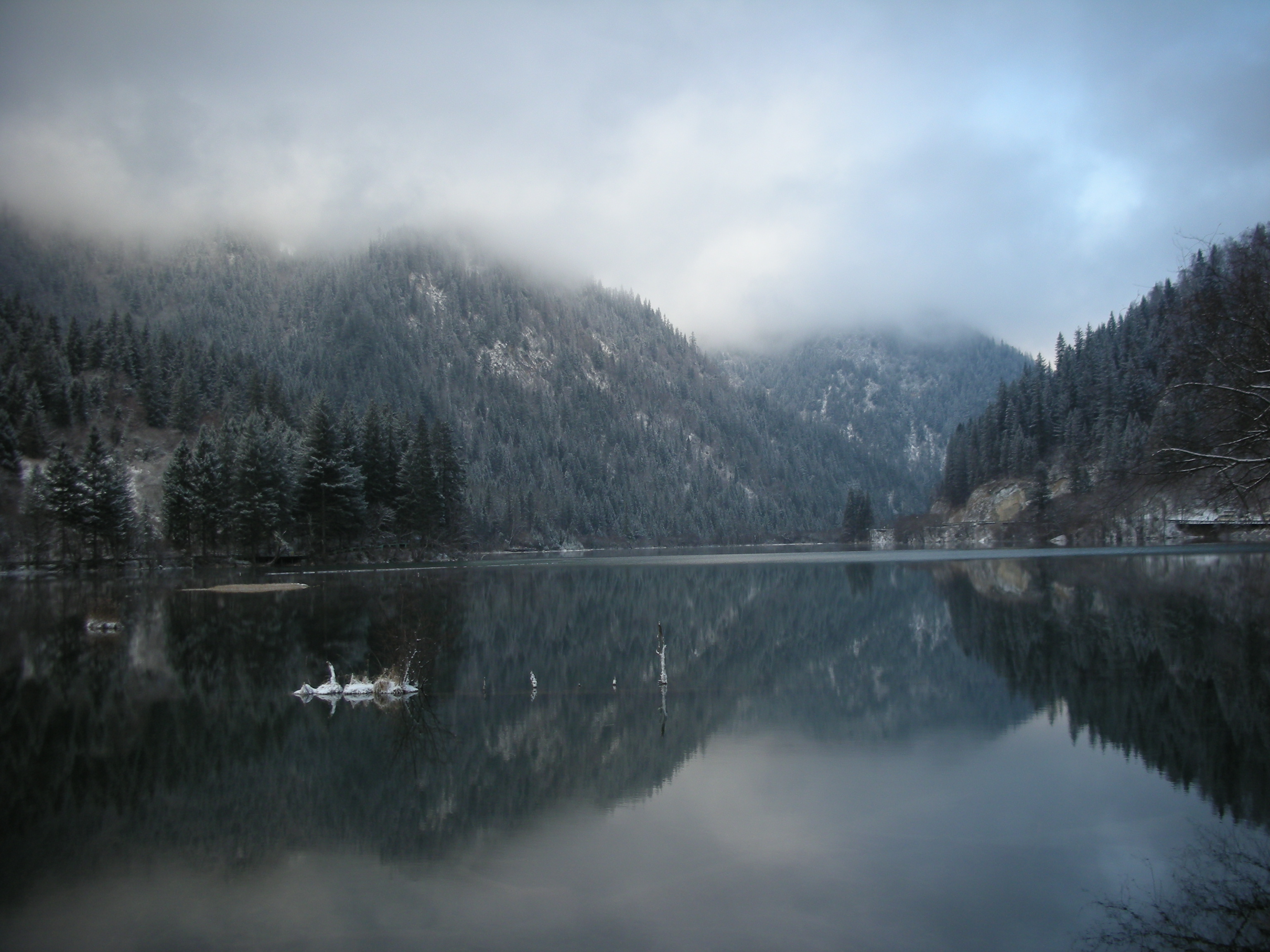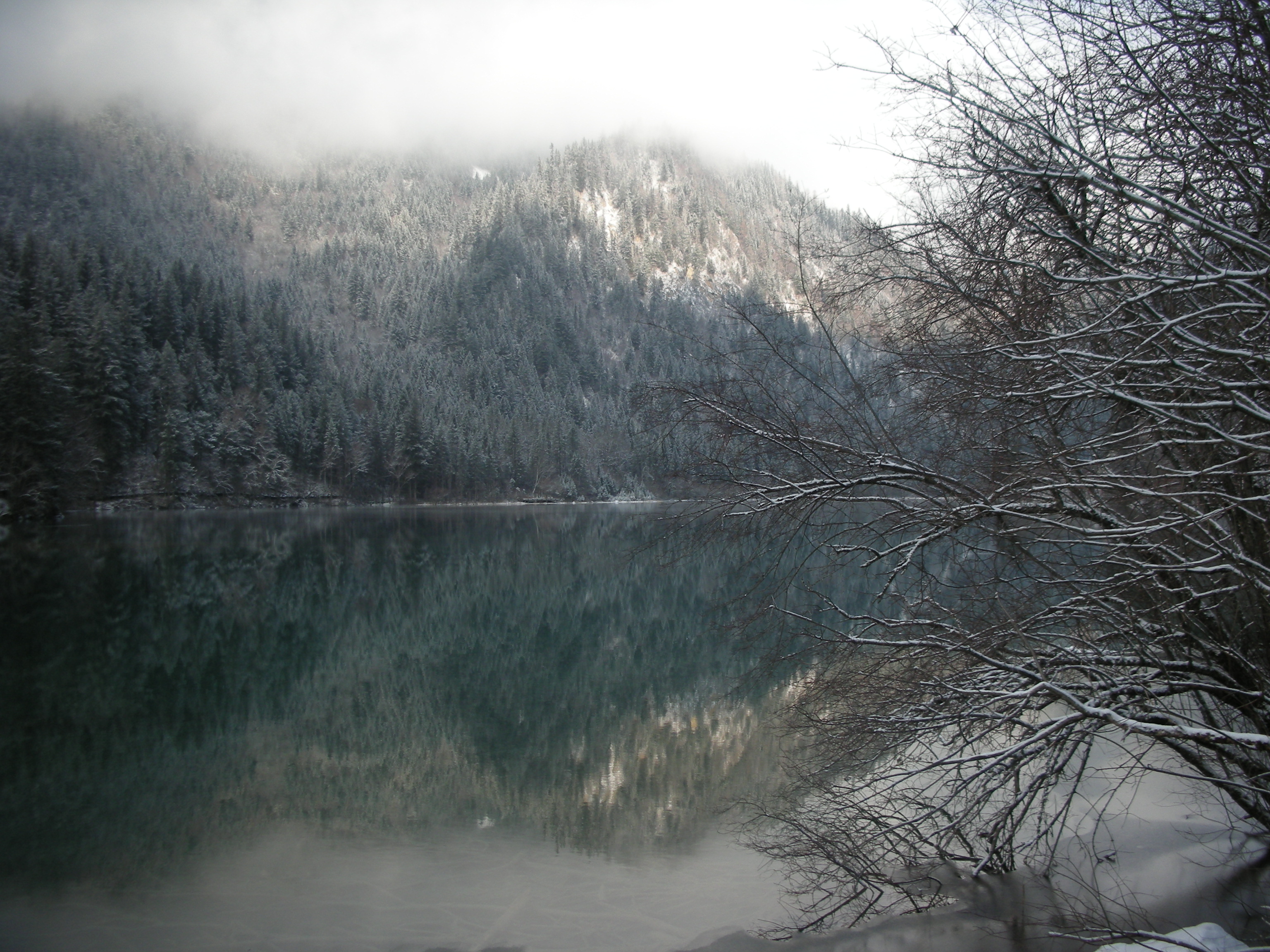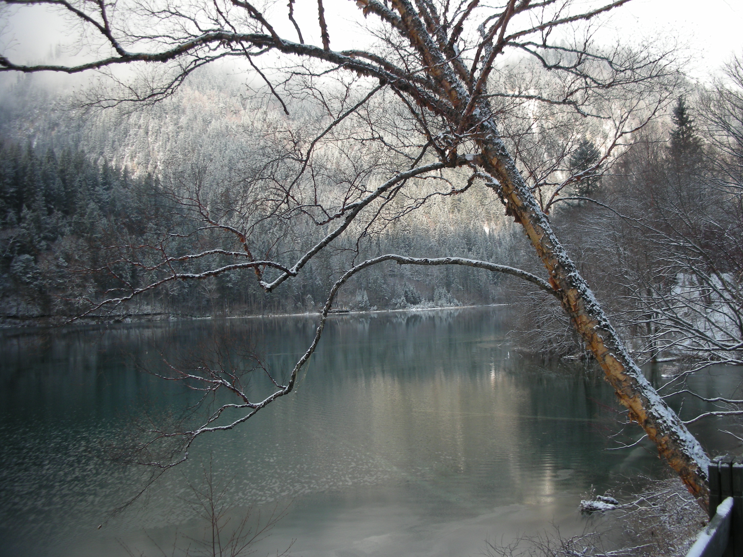 (湖面より飛び出た枝に雪が積もり、美しい自然の芸術品が出来上がっているようです。)