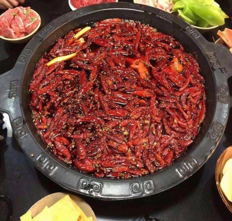 スープは唐辛子がたくさん入っているため、見るだけでお腹が痛くなるほど真っ赤!というより唐辛子を入れ過ぎ、赤を通り過ぎて真っ黒です。沸騰するとマグマみたいな火鍋となるのです。