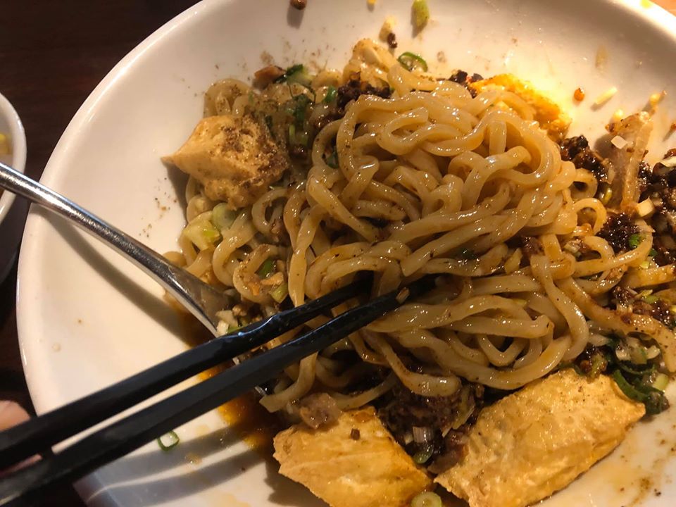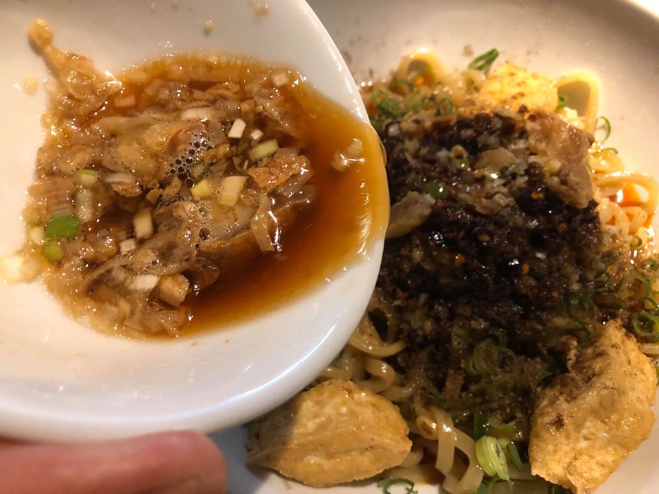注文してしばらくすると麺と油かす入りの少量のスープが添えられて出てきます。食べ方は油かす入りスープをお好み量だけかけ、かき混ぜて出来上がりです。タピオカ入りのモチモチで腰のある麺に麻辣な味を絡めることで旨みが口の中に広がります。まぜ麺なので混ぜて豆腐が崩れないように豆腐は厚揚げにしているようです。