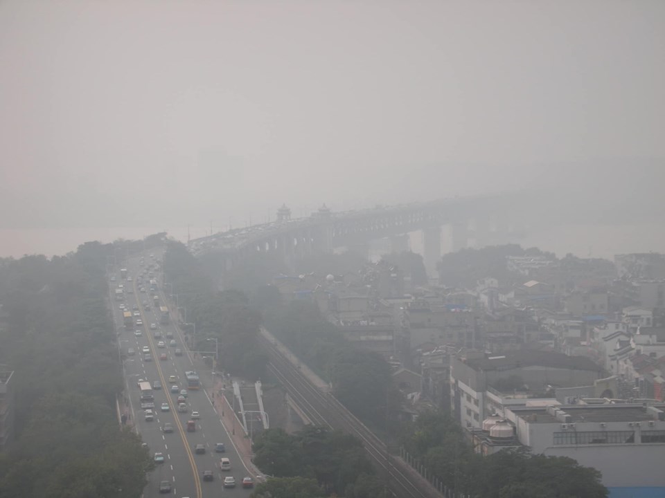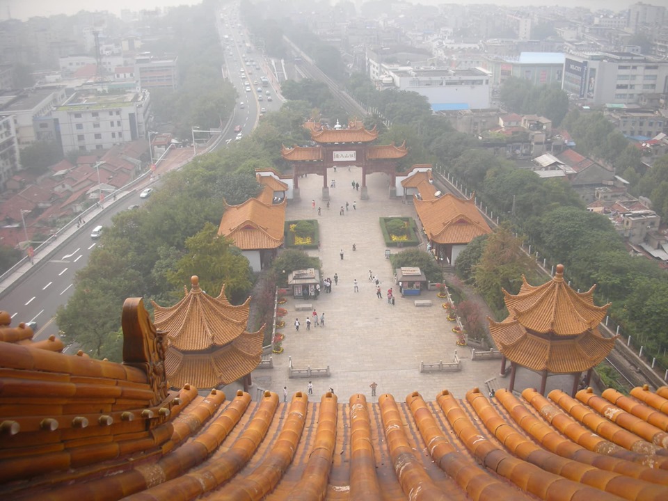 (黄鶴楼の天守閣から見た武漢市内。黄鶴楼は何度も戦災などで建て直されています。この日は霧が出ていました。.)