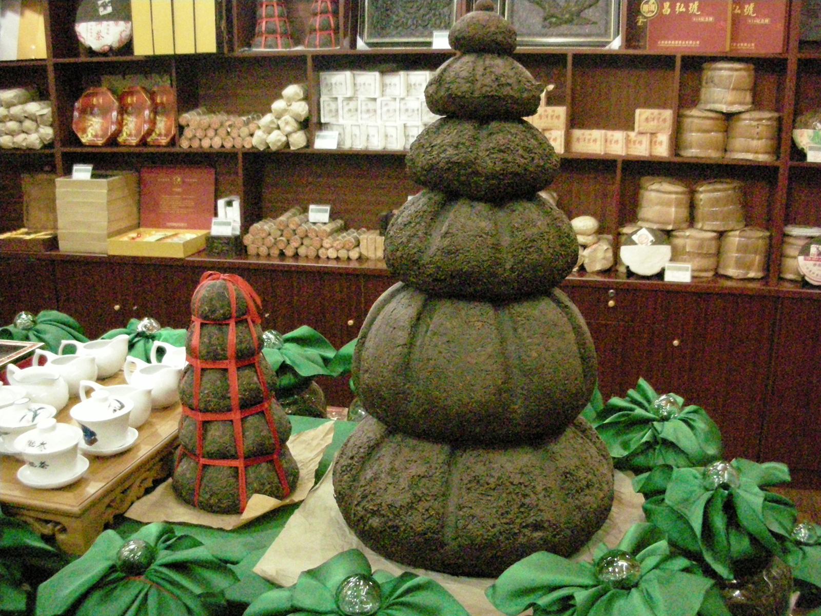 雲南省のお茶の中でもプーアル県で栽培されるプーアル茶は有名です。内陸部にある雲南で採れたお茶を遠くの消費地まで風味を落とさないように発送するため、茶葉を圧縮して発酵させ、円盤や様々な形状で茶店に売られています。長期間の保存ができ、時間が経つほど味がよくなります。プーアル茶にはデトックス効果、利尿作用、消化促進、さらには余計な脂肪を排出してくれる効果があるとも言われています。