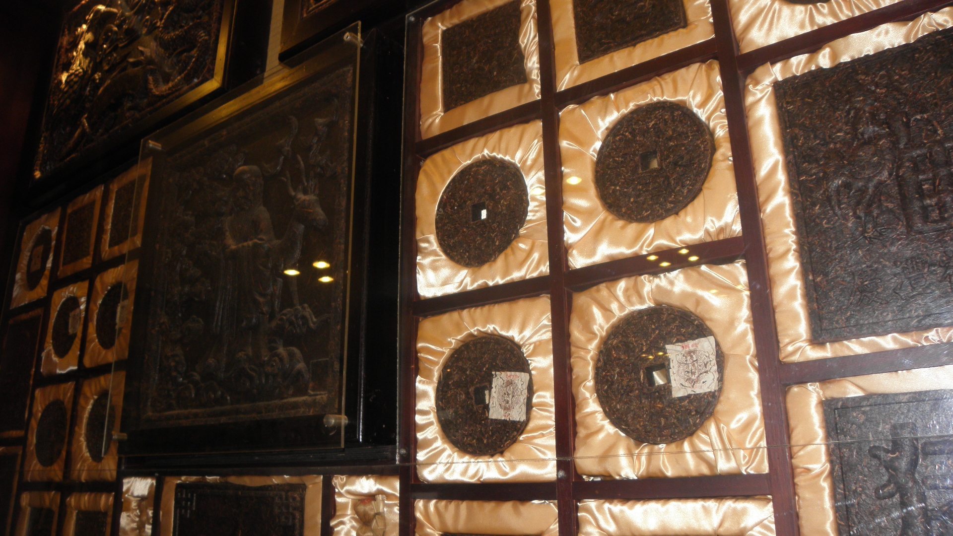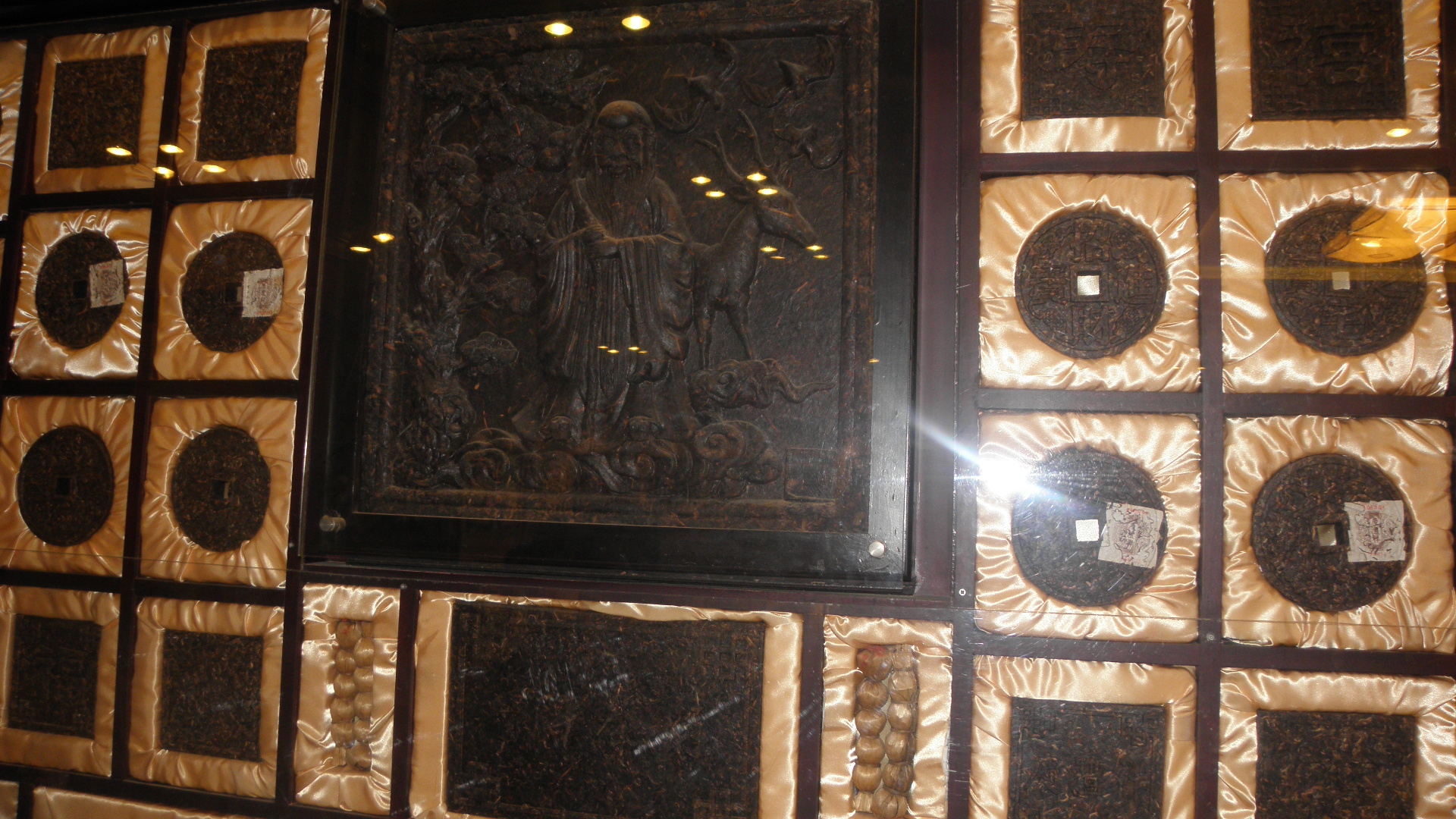 (まるで彫刻のように圧縮加工されたプーアル茶の茶葉。これを崩して飲むのはもったいないですね。)