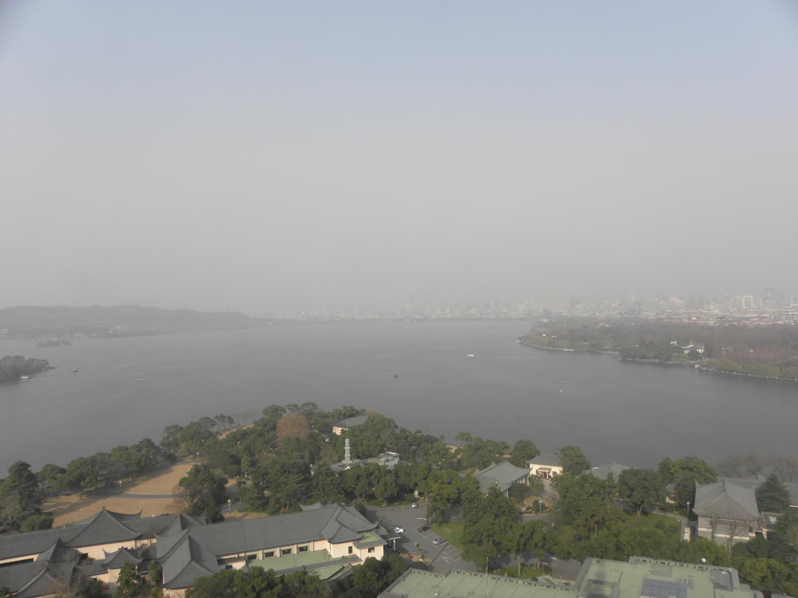 (雷峰塔から見た西湖。汪荘の庭園と建物です。敷地の先には西湖が広がります。)