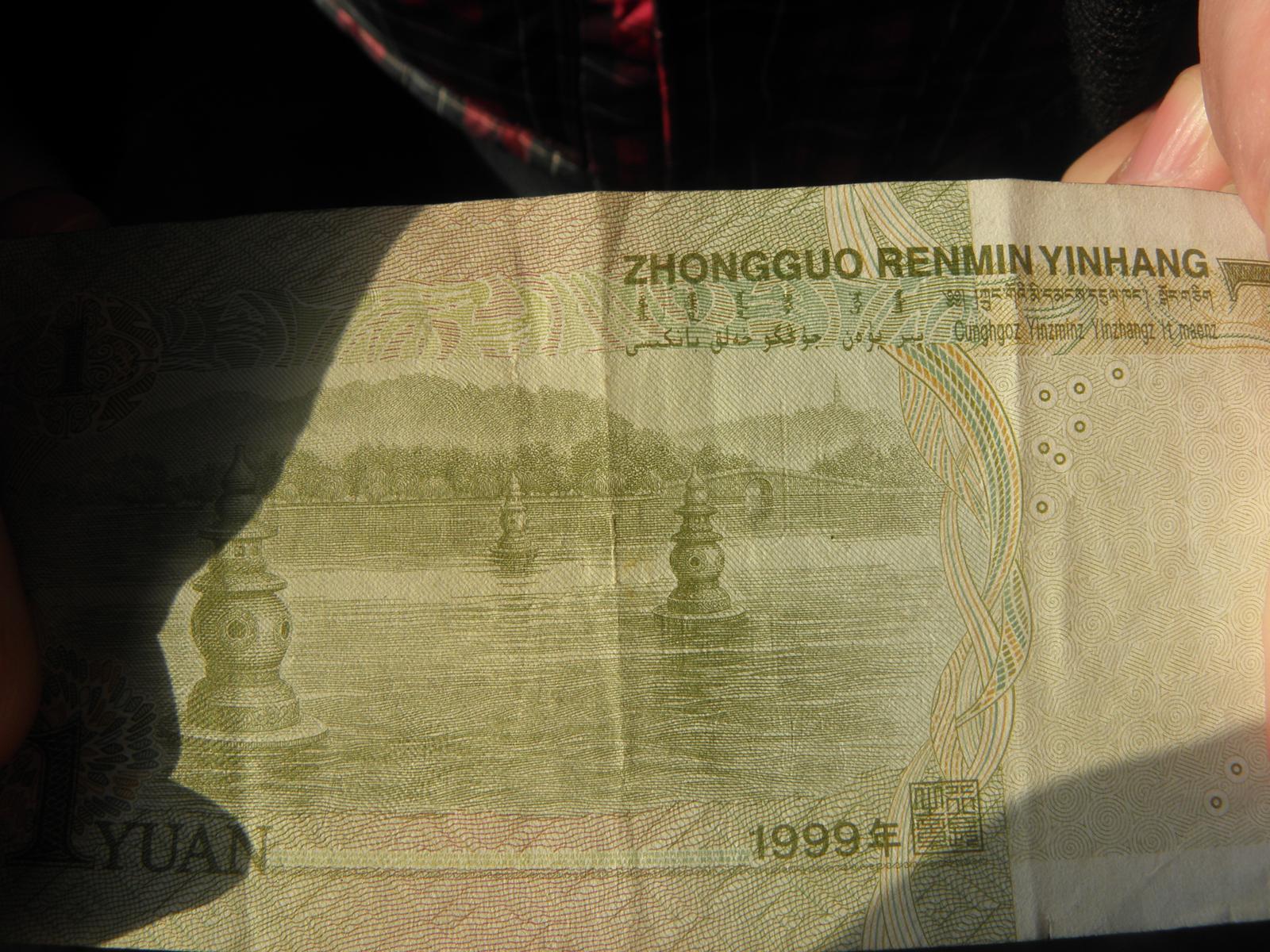 (中国の一元札。裏に描かれている周囲に立っている3本の石灯篭で、後ろにあるのが白蛇伝でも出てくる断橋です。)