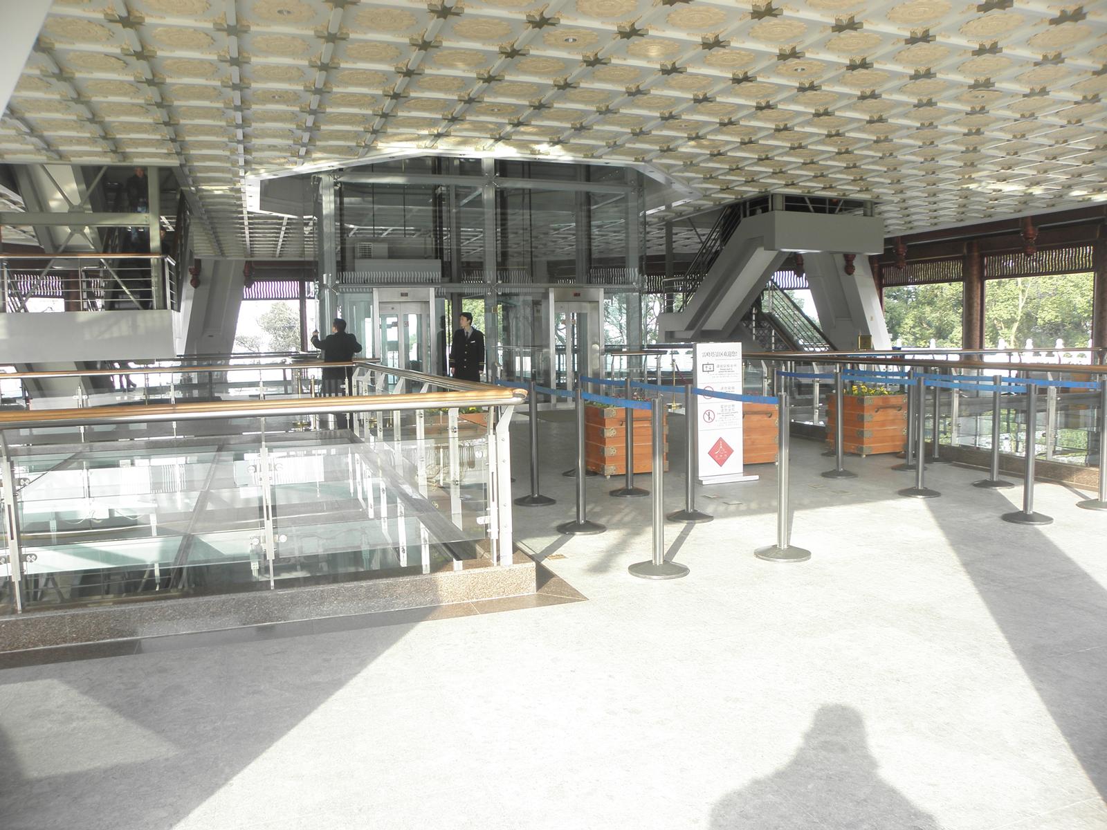 (雷峰塔の一階。ガラスでできたシースルーな造り。エレベータで最上階まで運んでくれます。)
