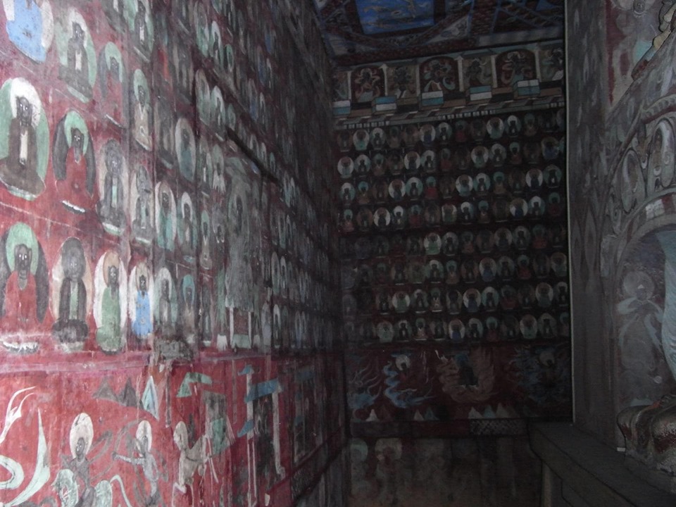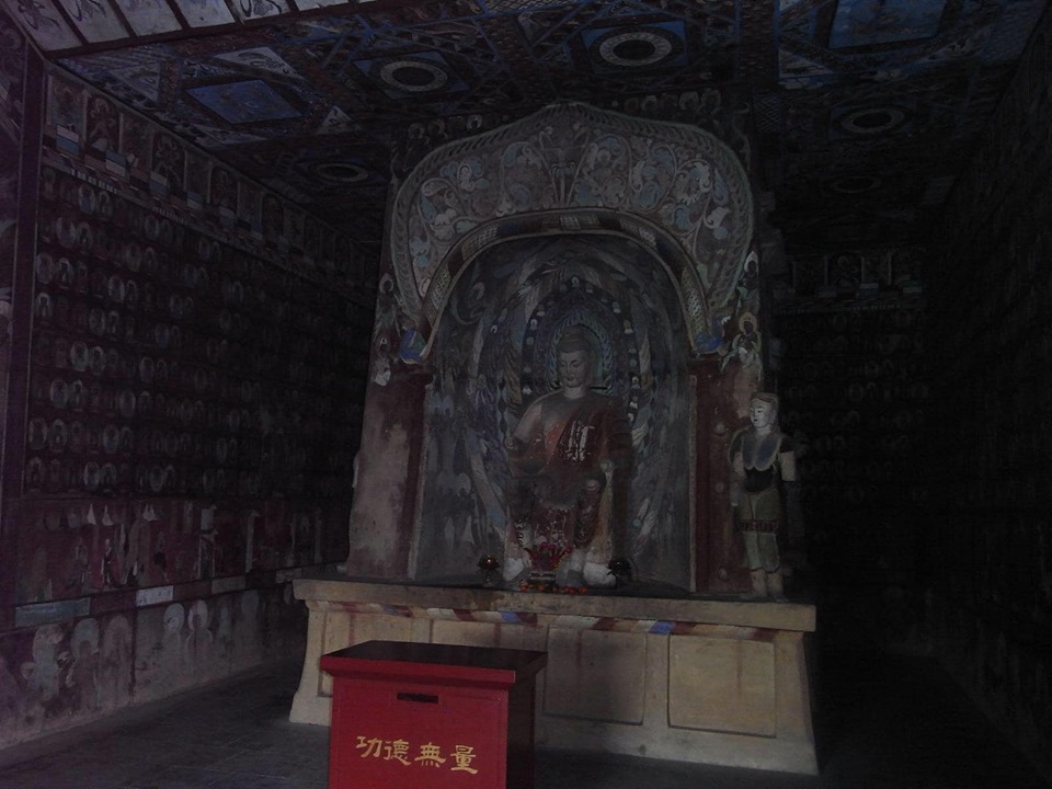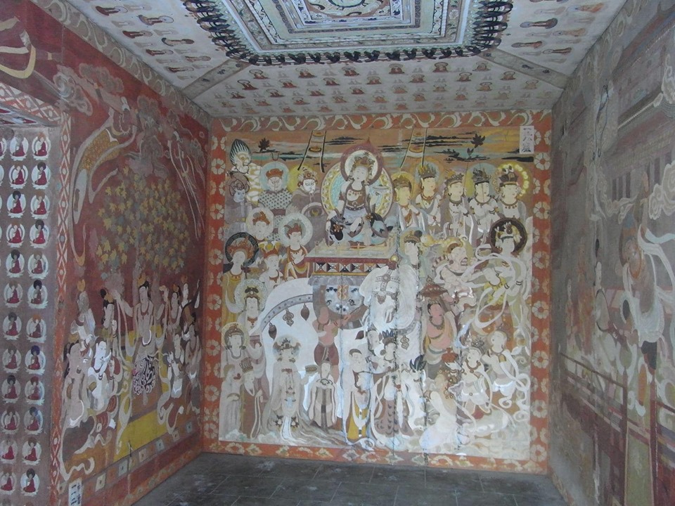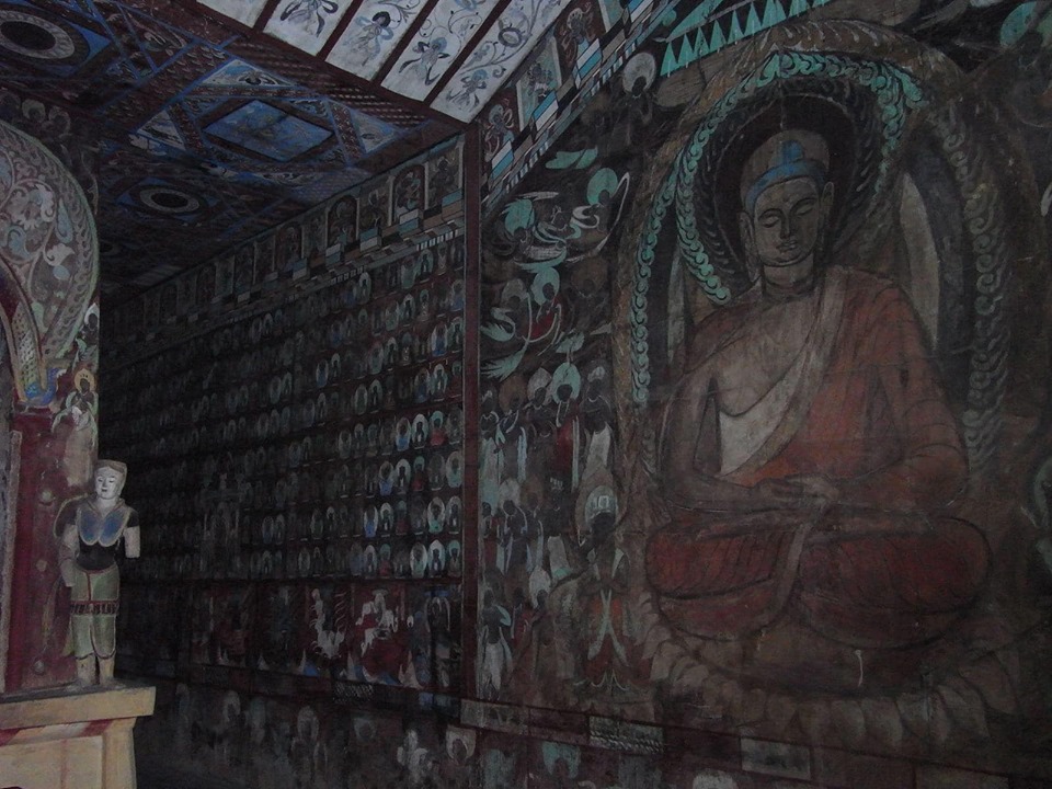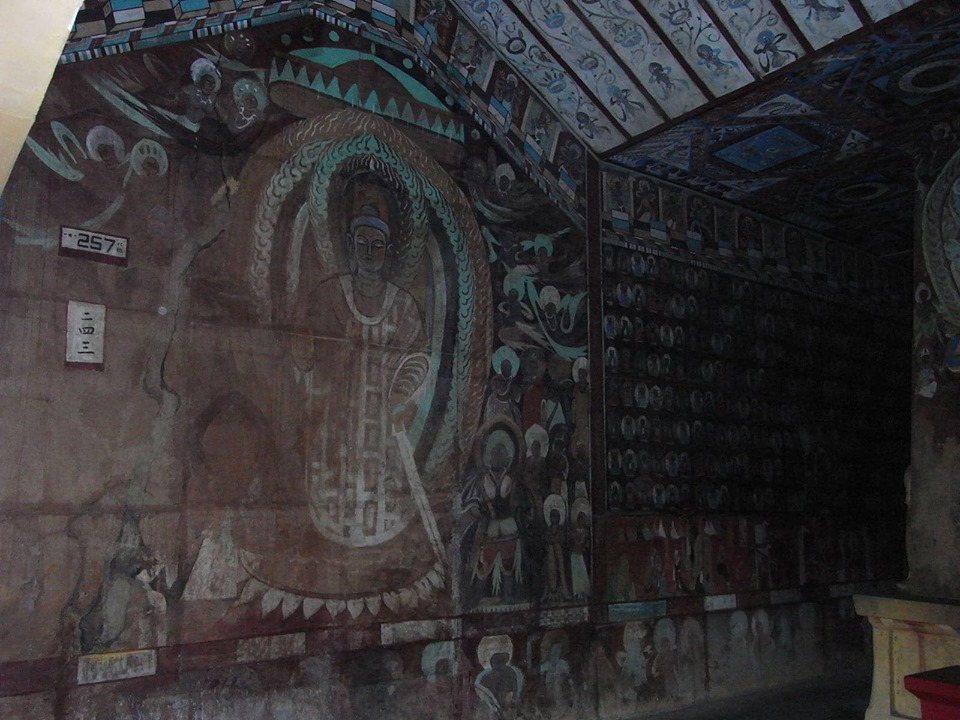 (2)莫高窟-甘粛省敦煌市にある仏教遺跡。4世紀から約千年間、元代に至るまで彫り続けられた。大小492の石窟に彩色塑像と壁画が保存されており、仏教美術として世界最大の規模を誇る。