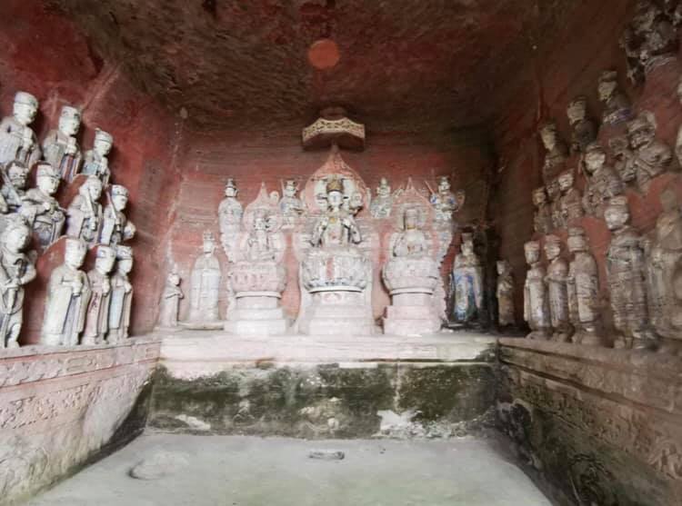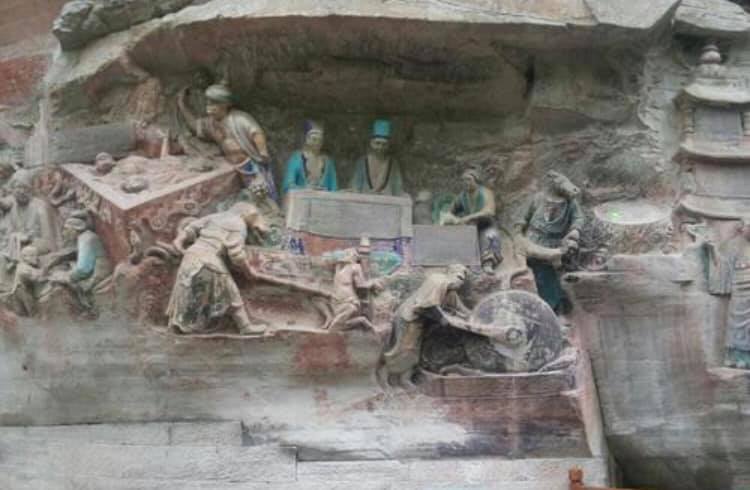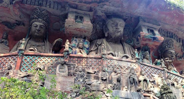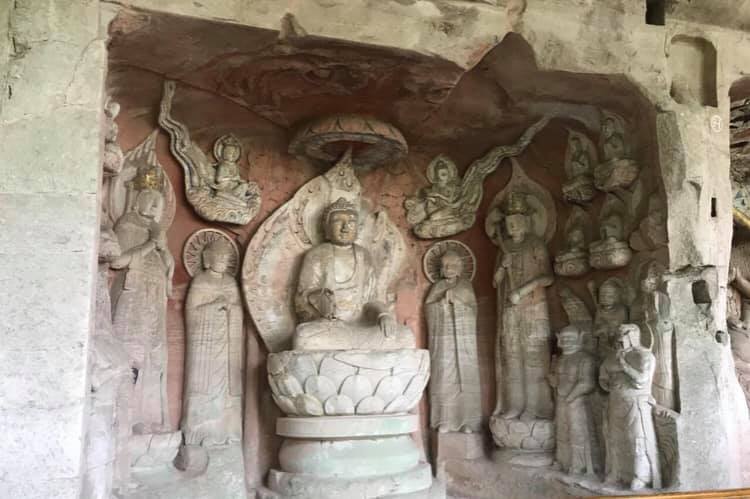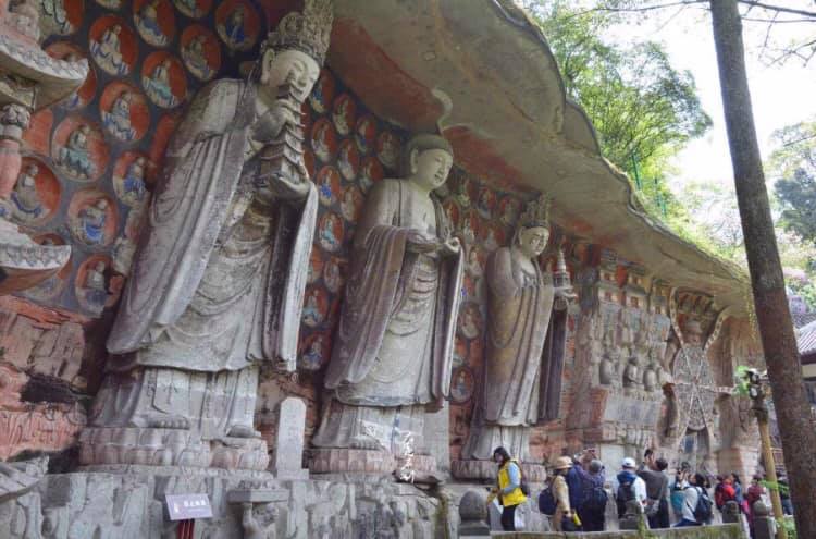 石窟は、インドからシルクロードを経て中国に伝わりました。中国の石刻群はインドの仏教の影響を受けたものが多いのですが、この大足石刻は仏教、儒教、道教を取り入れた中国独自の文化が見えるものとなっています。649年に大足石刻が切り開かれ、現在は5万体もの石刻を見ることができます。