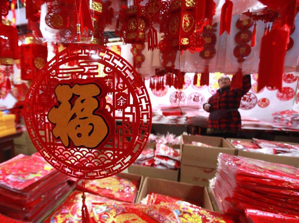 "衣服"については新しい服を買い、特に年男および年女の人は下着から外側まで赤い服にします。"日用品"についてはお椀とお箸等の日常使う物について新品に取り替えます。"迷信"については昔は神々にお祈りするために線香やロウソクなどを買っていましたが、現在では買う人が少なくなっています。"遊び"は花火や爆竹のことですが、場所によっては花火や爆竹が禁止され、買わない人も増えてきています。"装飾"については対聯(対句を書いて門扉や入り口に張る2枚の赤い紙)、窓花(中国の切り絵細工)、そして福の字等の装飾品を準備することです。中国にいると、どこのお店や露店でも目を奪うばかりの美しい装飾品が見られます。