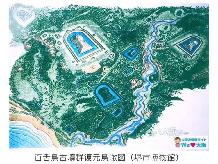 古墳時代の1,500年前は大阪湾の海岸線が古墳群のすぐ近くまで来ていたそうです。そして古墳群のあった辺りは海を渡って中国や朝鮮等の大陸からやってきた人達が瀬戸内海を通り、最初に到着した場所であったようです。そこから現在の奈良や京都等の目的地へ移動していました。