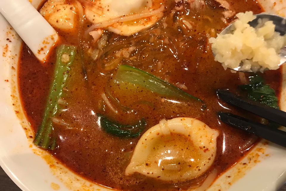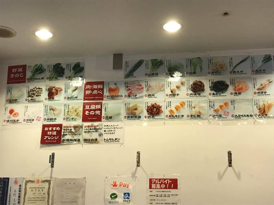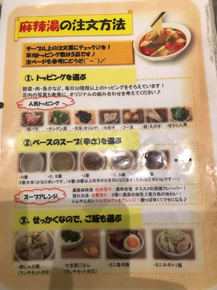 早速メニューを確認。トッピングがいろいろ選べるみたいで楽しみ!!2辛以上はホントに辛いとのことで勧めませんとのことでしたが、辛いのが大好きなので、とりあえず3辛にして水餃子、もやし、チンゲンサイ、羊肉をトッピングすることに。