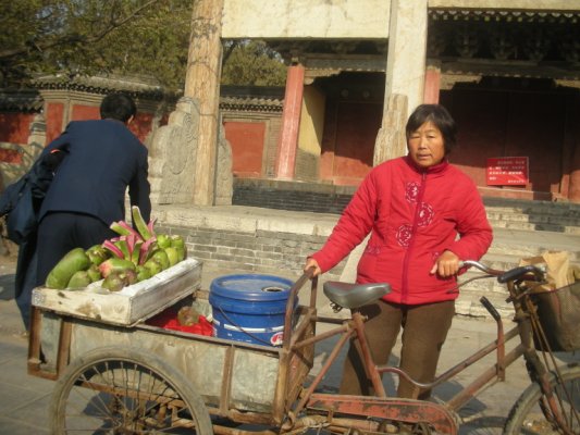 (曲阜城場内の道で果物を売る人。)