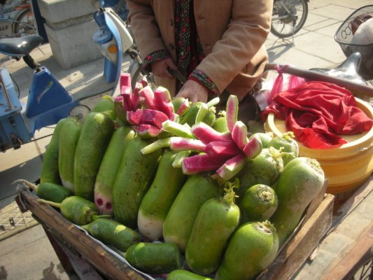 (赤大根を売るおばさん。)