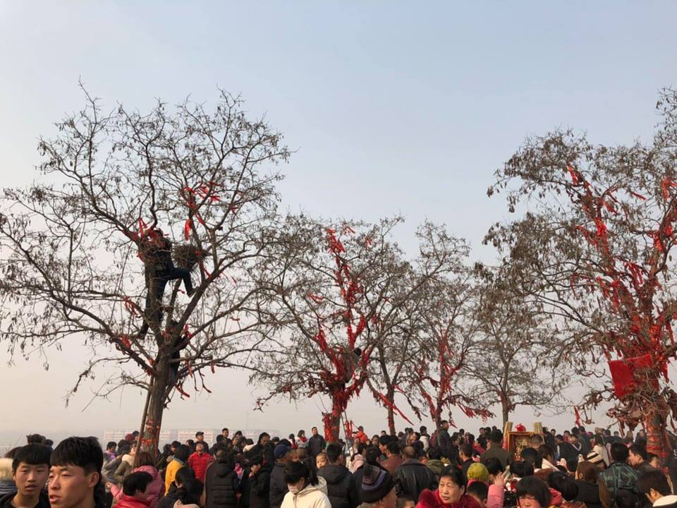 (春節で人がいっぱいです。コウノトリがいる木まで赤いお飾りでいっぱいですね。)
